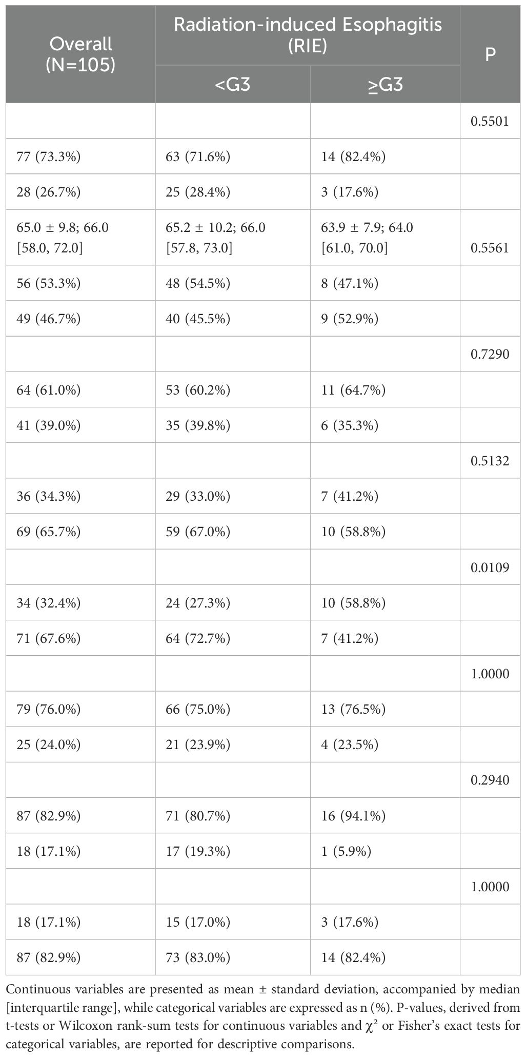 A total of 105 patients were enrolled, with an incidence of ≥G3 radiation-induced esophagitis of 16.2% (17/105). Within the overall cohort, 73.3% (77/105) were male, with a mean age of 65.0 ± 9.8 years and a median of 66.0 years [Q1–Q3: 58.0–72.0]. A history of smoking was present in 39.0% (41/105). The distribution of stage III/IV disease was 34.3% and 65.7%, respectively. KPS ≥80 was observed in 76.0% (79/104). NSCLC accounted for 82.9% (87/105), and prior chemotherapy was reported in 82.9% (87/105).