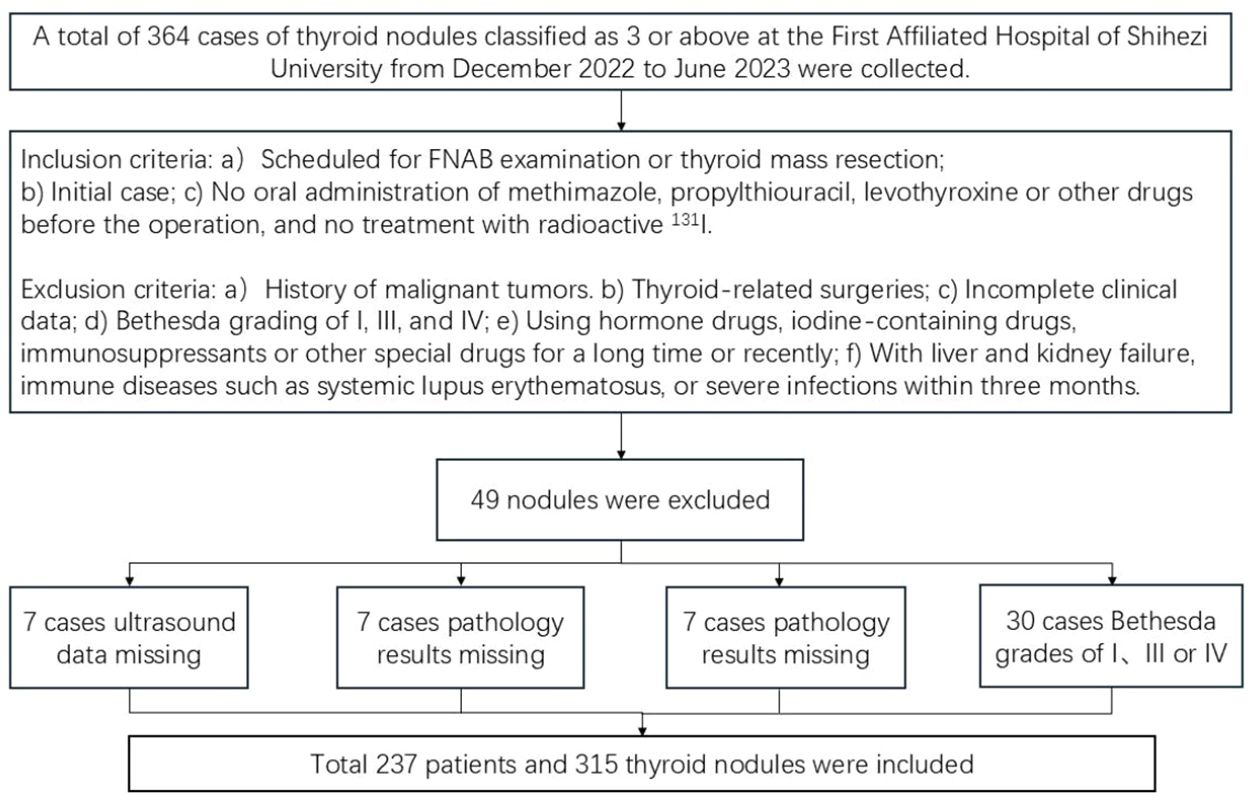 (l) Patients with a history of malignant tumors (2); Patients who have previously undergone thyroid-related surgery (3); Patients with incomplete clinical data(e.g., lacking thyroid two-dimensional ultrasound examination results, pathological diagnosis results, etc.) (4); Patients with Bethesda grading of I, III, or IV after FNAB (5); Patients who have been taking or using topical steroid medications, iodine-containing medications, immunosuppressants, or other special medications for an extended period or recently (6);Patients with liver or kidney failure, immune disorders such as systemic lupus erythematosus(SLE), or severe infections within the past three months. A total of 315 nodules meeting the criteria were ultimately included (Figure 1).