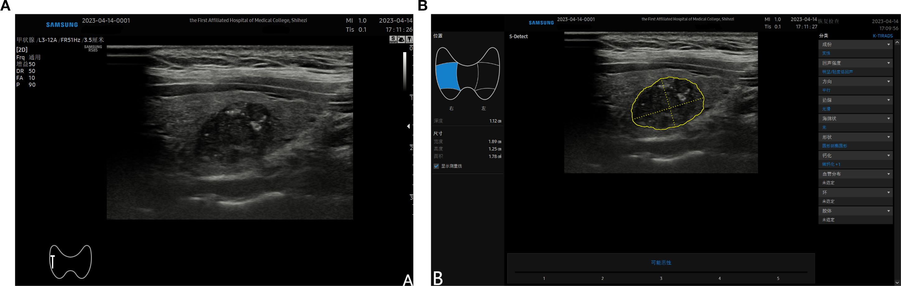Figure 2. (A) shows a malignant nodule located in the mid-section of the right lobe of the thyroid detected by ultrasound; (B) demonstrates the automatically outlined nodule area after entering the S-Detect mode and selecting the “auto tracing” option. The nodule characteristics are displayed on the right side of the screen, and the analysis results are shown at the bottom.