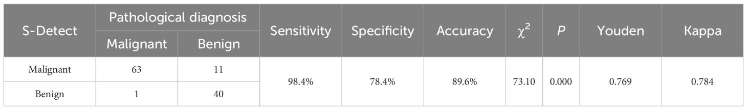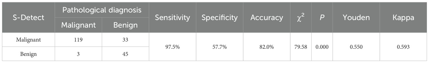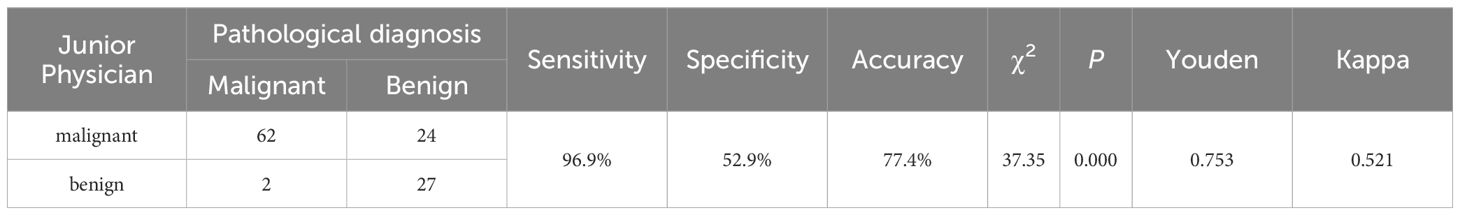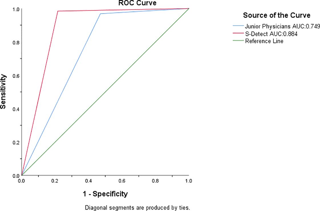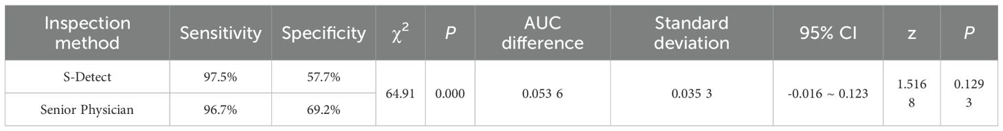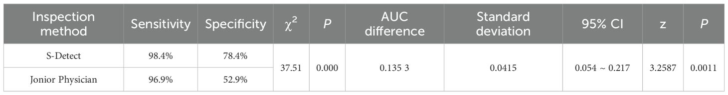 In the junior group, a chi-square test was performed to compare the sensitivity and specificity of S-Detect with those of junior physicians’ diagnoses, yielding a chi-square value of 37.51, P< 0.05 (Table 6). A DeLong test was also conducted to compare the AUC values of the two, revealing statistical significance with P = 0.001<0.01. The difference was statistically significant. (Table 6).
