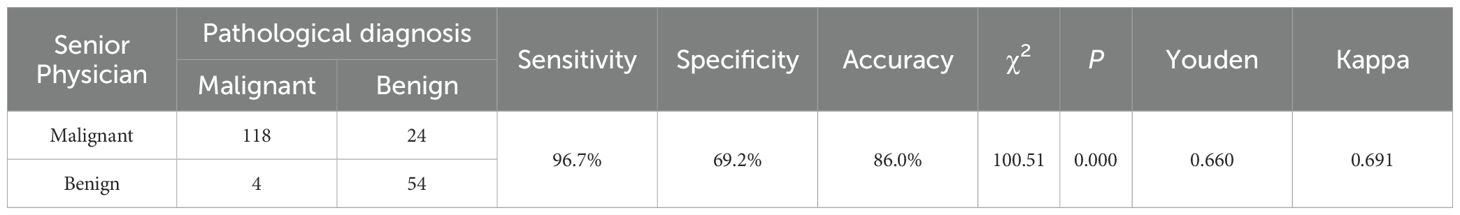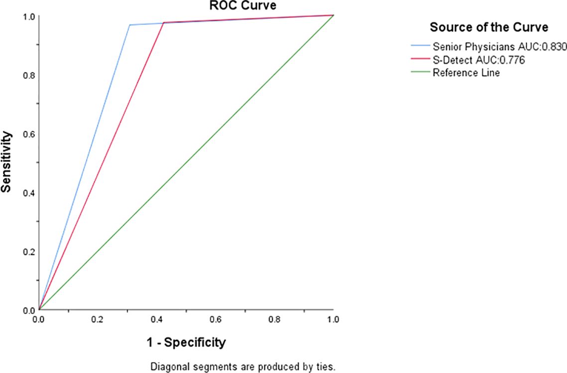 In comparison with the diagnostic efficacy of the senior physicians: The sensitivity of S-Detect technology in diagnosing benign versus malignant nodules is comparable to that of senior-level ultrasound practitioners, whilst its specificity is marginally lower than that of senior-level practitioners, with statistically significant differences observed (sensitivity 97.5% vs 96.7%, specificity:57.7% vs 69.2%, P = 0.000), but slightly lower AUC (0.776 vs 0.830, P = 0.129>0.05), with no statistically differences. The diagnostic consistency of S-Detect was also slightly lower than that of senior physicians (Kappa value 0.593 vs 0.691). This indicates that S-Detect is comparable to senior physicians in terms of detecting malignant nodules (sensitivity 97.5% vs 96.7%), but senior physicians demonstrate superiority in distinguishing benign nodules (specificity 69.2% vs 57.7%). However, there is no significant difference in overall performance between S-Detect and senior physicians.