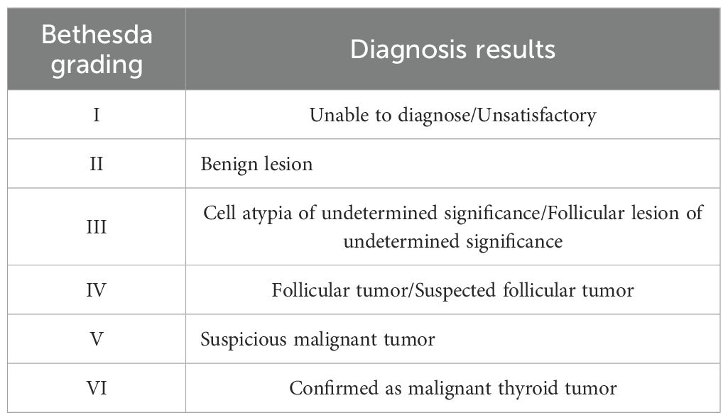 The patient’s postoperative pathology or FNAB results are provided in a standardized pathology report issued by a pathologist with more than five years of experience, FNAB results are graded according to the 2017 Bethesda Thyroid Cytopathology Reporting System (7), with grading criteria shown in (Table 1). Postoperative thyroid pathology is based on the final pathological paraffin-embedded section as the gold standard. If a patient with a nodule undergoes only FNAB without nodule excision for histopathological assessment, Bethesda Grade V-VI is considered malignant; Bethesda Grade II, with nodule stability or volume reduction observed via ultrasound follow-up, is considered benign (8), Among the 217 patients with 315 nodules, 173 patients underwent FNAB, involving227 nodules, of which 59 nodules were classified as Bethesda Grade II and did not undergo further nodule excision surgery; 165 patients underwent thyroid nodule excision surgery, involving 217 nodules.