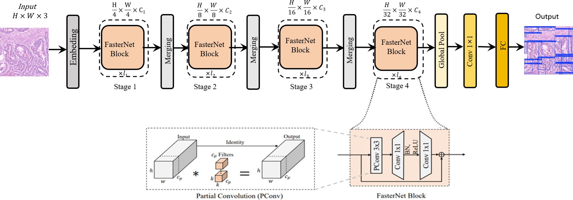 While the standard backbone in YOLOv11s is effective, it represents a general-purpose design. When applied to pathological images—which are characterized by complex backgrounds and a high degree of similarity and redundancy between adjacent regions or across different feature map levels—this generic approach can lead to exhaustive convolutional operations. This results in an inefficient allocation of computational resources and a constrained capacity for extracting critical features. To address this limitation, we introduce the FasterNet network architecture. In contrast to standard convolutional backbones, FasterNet is architected around the principle of Partial Convolution (PConv), a design that reduces redundant computations, thereby enhancing computational efficiency while simultaneously promoting hardware-friendly implementation. This novel neural network family demonstrates exceptional computational efficiency and robust performance across diverse vision tasks. The architecture prioritizes hardware-friendly design through structural simplification, as illustrated in Figure 1. The framework comprises four hierarchical levels, each initiated with either an embedding layer (4×4 convolution with stride 4) or a merging layer (2×2 convolution with stride 2) for spatial downsampling and channel expansion. Each stage incorporates multiple FasterNet modules, with increased module density in the final two stages where memory access costs diminish and computational intensity (FLOPS) escalates. The core FasterNet module employs a partial convolution (PConv) layer followed by two point-wise convolutional (PWConv) layers, forming an inverted residual block with expanded intermediate channels and skip connections for feature reuse. Strategic architectural optimizations include: 1) Streamlined deployment of normalization and activation layers (post-PWConv only) to balance feature diversity with reduced inference latency; 2) Preferential use of batch normalization (BN) over layer normalization (LN) to leverage operator fusion capabilities with adjacent convolutional layers; 3) Dynamic resource allocation through multi-scale feature fusion - preserving moderate computational capacity in shallow layers for microscopic pattern extraction while intensifying FasterNet module density in deeper layers for macroscopic feature interpretation. These design principles collectively enhance detection accuracy while maintaining computational efficiency, particularly crucial for high-resolution pathological image analysis (17).