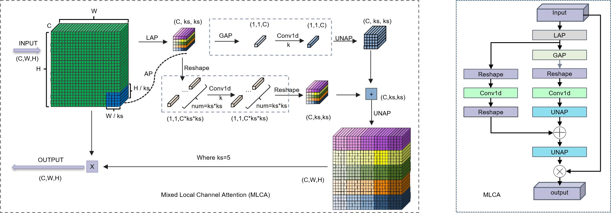 Figure 2. Left: Schematic diagram of the MLCA. Right: The structure of the MLCA. LAP (Local Average Pooling) which divides the feature map into k * k patches and applies average pooling to each patch; GAP (Global Average Pooling), which uses adaptive pooling to reduce the feature map to a 1 * 1 output size; UNAP (Anti-average Pooling), which mainly focuses on the figures) properties and scaling to the needed size.