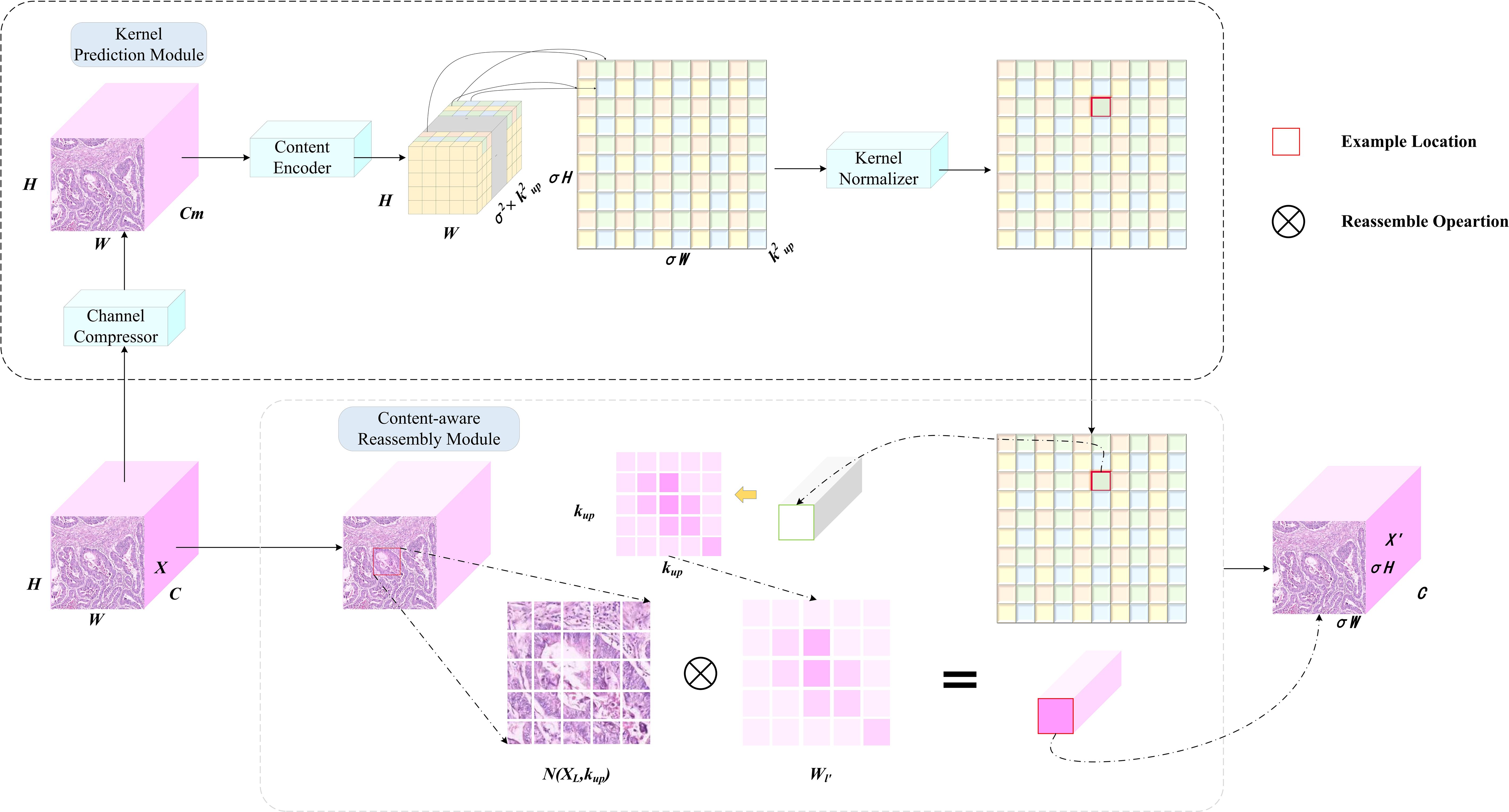 In histopathology, the precise delineation of lesion boundaries is of paramount importance for diagnosis. However, the feature fusion module in YOLOv11s utilizes conventional upsampling methods, which are characterized by fixed convolutional kernel weights that remain agnostic to the input content. This static approach can result in the imprecise demarcation of cancer cell boundaries within pathological images and may also lead to suboptimal contextual awareness. To address these limitations, we implement CARAFE, which enhances contextual perception through large receptive fields (up to 5×5) and dynamically predicts upsampling kernel weights based on feature semantics. This adaptive mechanism significantly improves the model’s capability to exploit discriminative features in histopathological images with complex backgrounds, particularly for detecting subtle malignant patterns obscured by stromal interference (20).