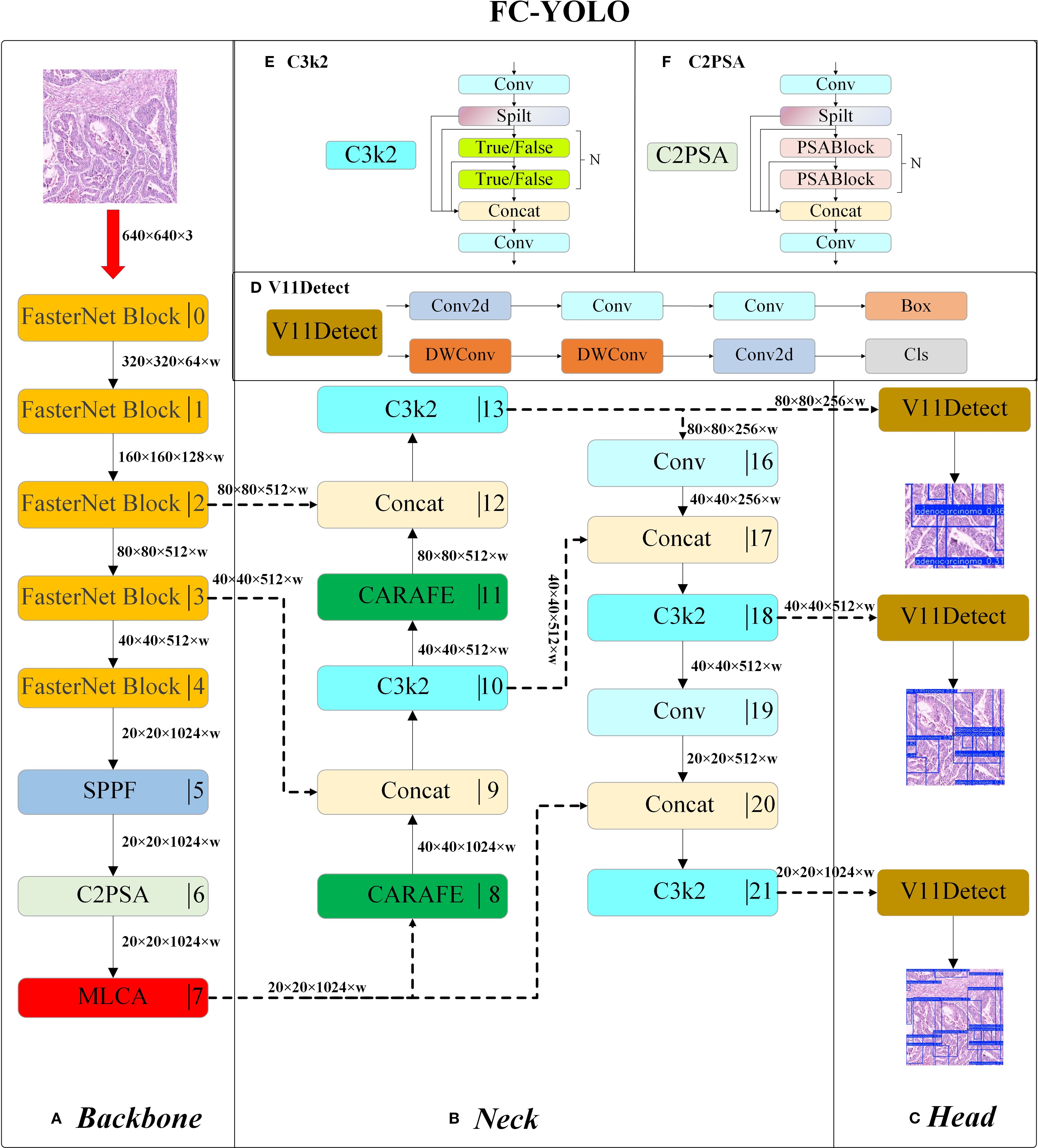 In summary, mainstream deep learning models for the detection of gastric adenocarcinoma in pathological images continue to face several critical challenges. High-accuracy models are often characterized by high computational complexity and prolonged inference times, which constrains their practical deployment in resource-limited hospitals and impedes their ability to meet the real-time requirements of clinical workflows. Conversely, lightweight models typically lack the requisite accuracy for reliable diagnosis. To address these limitations, we propose the FC-YOLO model to establish a deep learning framework capable of concurrently achieving high accuracy, rapid inference, and a lightweight design, tailored to the unique challenges of gastric adenocarcinoma pathology detection. This model incorporates three key modifications to the YOLOv11s baseline: first, the backbone network is replaced with FasterNet to more efficiently extract multi-scale features while enhancing inference speed; second, a lightweight MLCA attention mechanism is introduced to bolster the model’s focus on critical diagnostic regions; and finally, the CARAFE upsampling operator is employed for a more precise restoration of lesion boundary details.