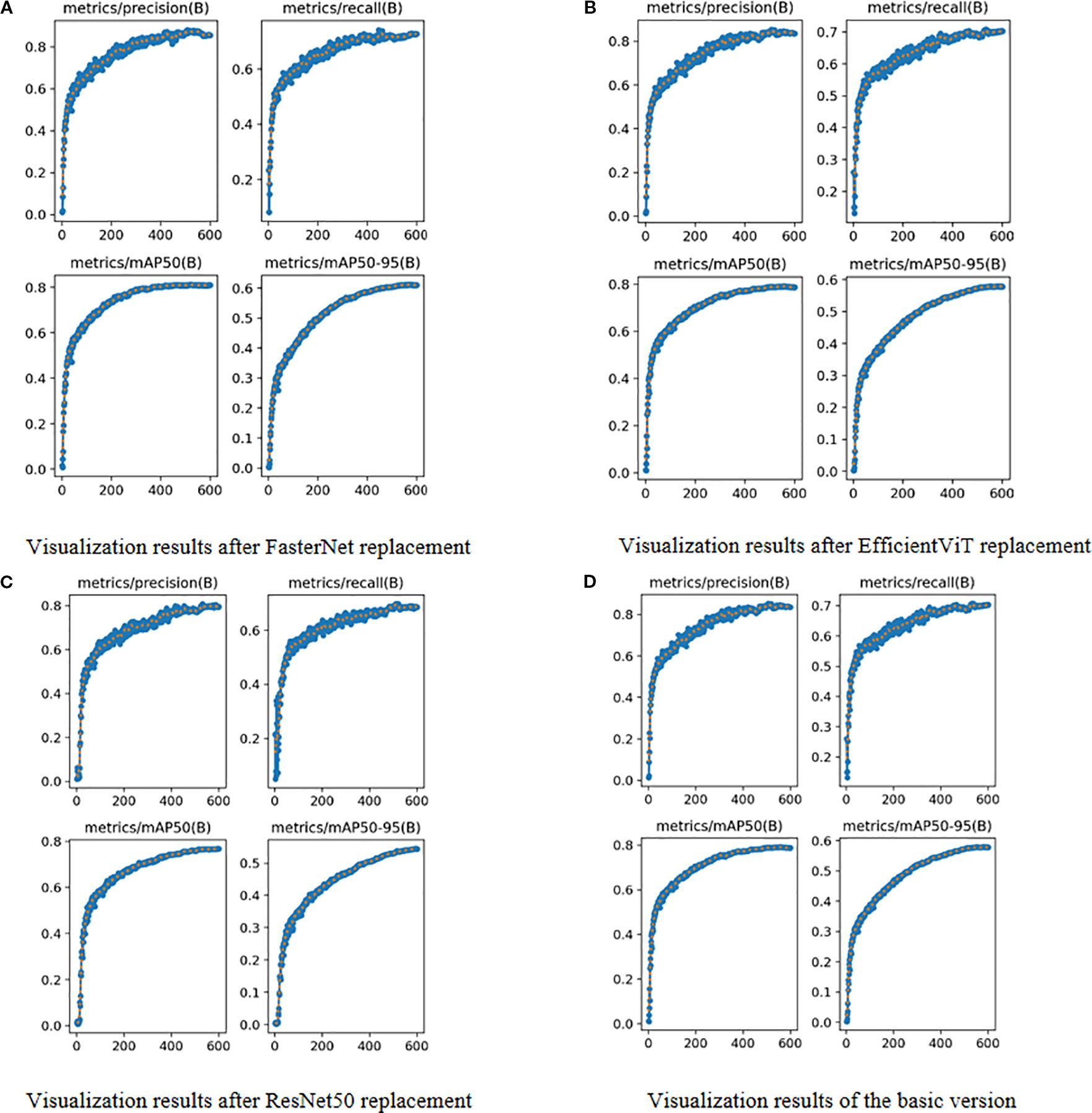Figure 5. Visual Comparison of Different Backbone Networks. (A) Visualization results after FasterNet replacement. (B) Visualization results after EfficientViT replacement. (C) Visualization results after ResNet50 replacement. (D) Visualization results of the basic version.
