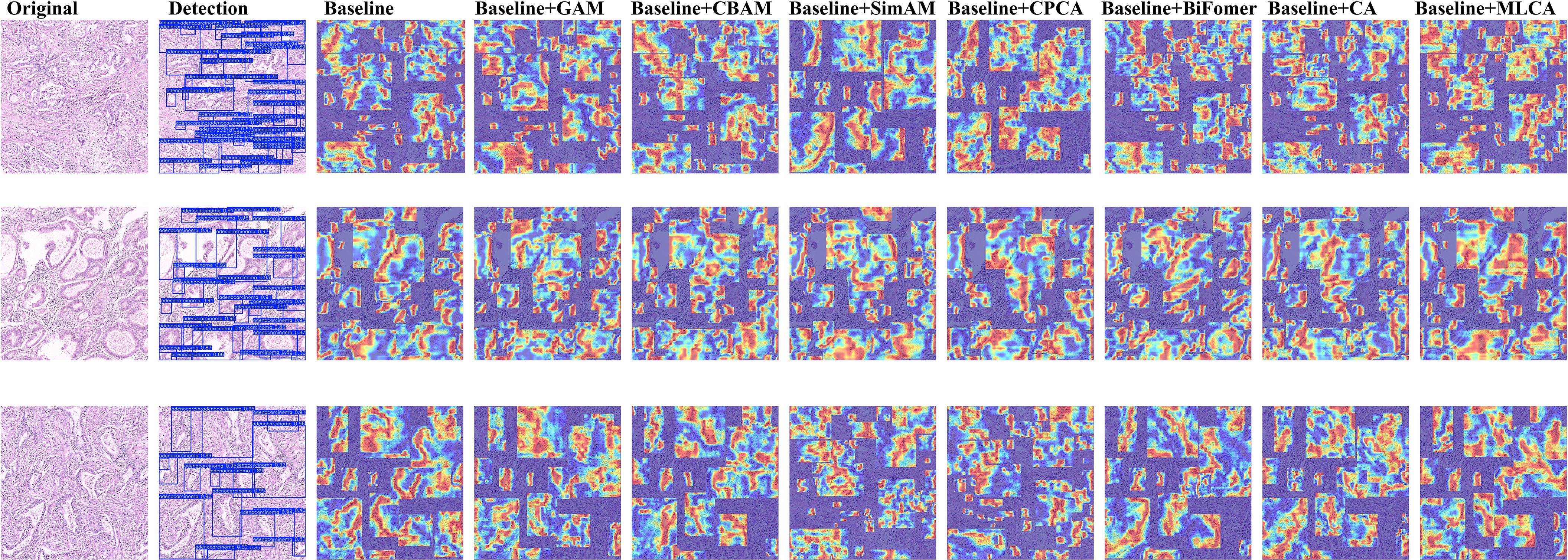 As shown in Figure 6, our comparative experiments revealed that the MLCA attention mechanism outperforms conventional modules like CBAM and CA. Specifically, MLCA generates heatmaps with significantly expanded spatial regions of interest, indicating its ability to guide the model in capturing multi-scale features from target regions. By fusing local details with global contextual information, MLCA creates a comprehensive representation of the Region of Interest (ROI), a capability crucial for detecting minute lesions in pathological images. Furthermore, the high-activation regions (indicated in red) generated by MLCA are more extensive, suggesting an enhanced capacity for extracting salient features. We attribute this advantage to MLCA’s unique dual-path weight allocation strategy. One path captures multi-resolution features via an atrous convolution pyramid, while the other employs channel-spatial joint attention to filter critical information. This dual approach effectively suppresses interference from complex tissue backgrounds, such as stromal fibrosis and inflammatory infiltration. Consequently, MLCA demonstrated superior performance in detecting gastric adenocarcinoma in pathological images compared to the other attention mechanisms tested.