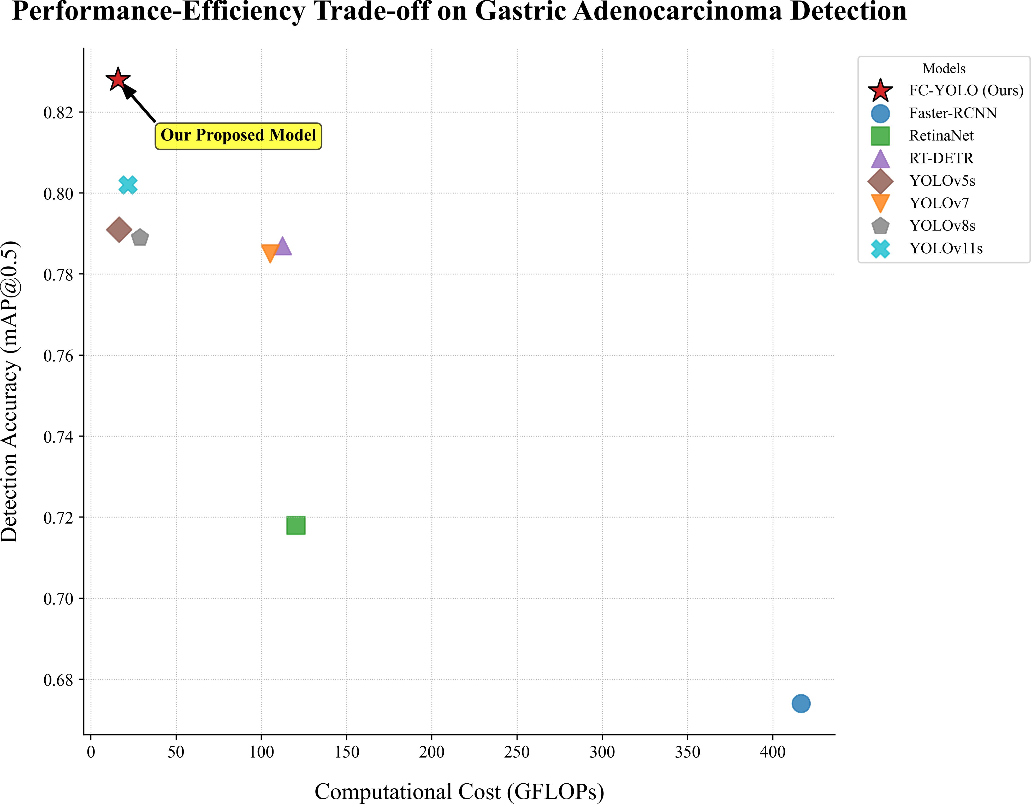 Furthermore, our results also revealed the promising potential of the RT-DETR model in this detection task, which, to some extent, underscores the advantage of Transformer architectures in capturing global contextual information and offers valuable insights for the future direction of medical pathology image recognition. However, our observations during training indicate that Transformer-based models generally entail a larger parameter count and greater computational complexity compared to purely CNN-structured YOLO models. Although RT-DETR optimizes efficiency by integrating a hybrid CNN backbone with partial Transformer layers, its training and inference phases still demand more substantial computational resources and prolonged durations relative to certain lightweight YOLO variants. Crucially, the YOLO series of models offers a significant advantage in terms of ease of engineering and deployment, making them more accommodating for hospitals with limited hardware resources. Therefore, from a comprehensive standpoint that considers detection accuracy, computational efficiency, and practical deployment feasibility, our proposed FC-YOLO model still demonstrates a superior overall advantage compared to the Transformer-integrated RT-DETR model for the task of gastric adenocarcinoma pathology detection.