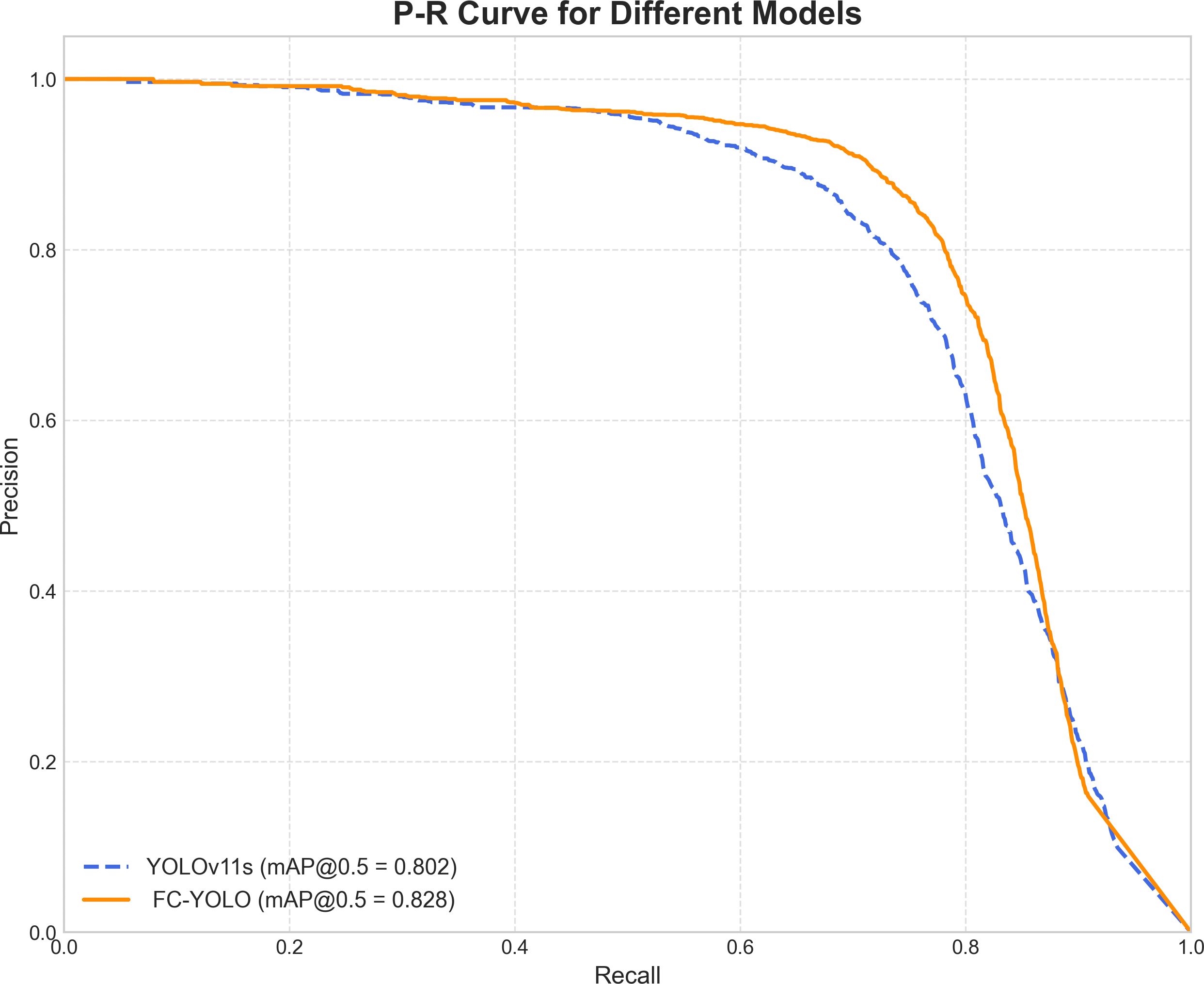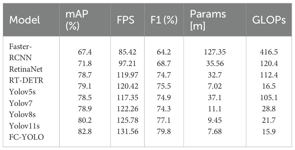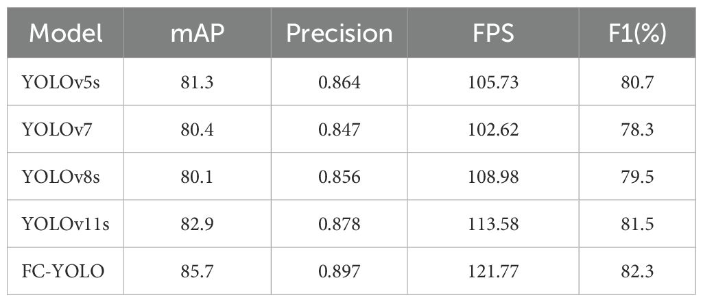 In our subsequent experimental evaluation, we used mean Average Precision (mAP), F1 score, Frames Per Second (FPS), parameter count, and Giga Floating-point Operations Per Second (GFLOPS) as key performance metrics. As detailed in Table 8, our proposed FC-YOLO algorithm achieved a state-of-the-art mAP of 82.8%. Compared to the YOLOv11s baseline, FC-YOLO improved the mAP by 2.6% and the F1 score by 2.7% (to 79.8%), indicating a superior balance between precision and recall. Crucially, these accuracy gains were achieved alongside significant efficiency improvements. The integration of the FasterNet backbone and CARAFE upsampling module allowed us to reduce the parameter count by 18.7% (from 9.45M to 7.68M) and the computational load by 26.7% (from 21.7 to 15.9 GFLOPS), while increasing inference speed by 4.6%.