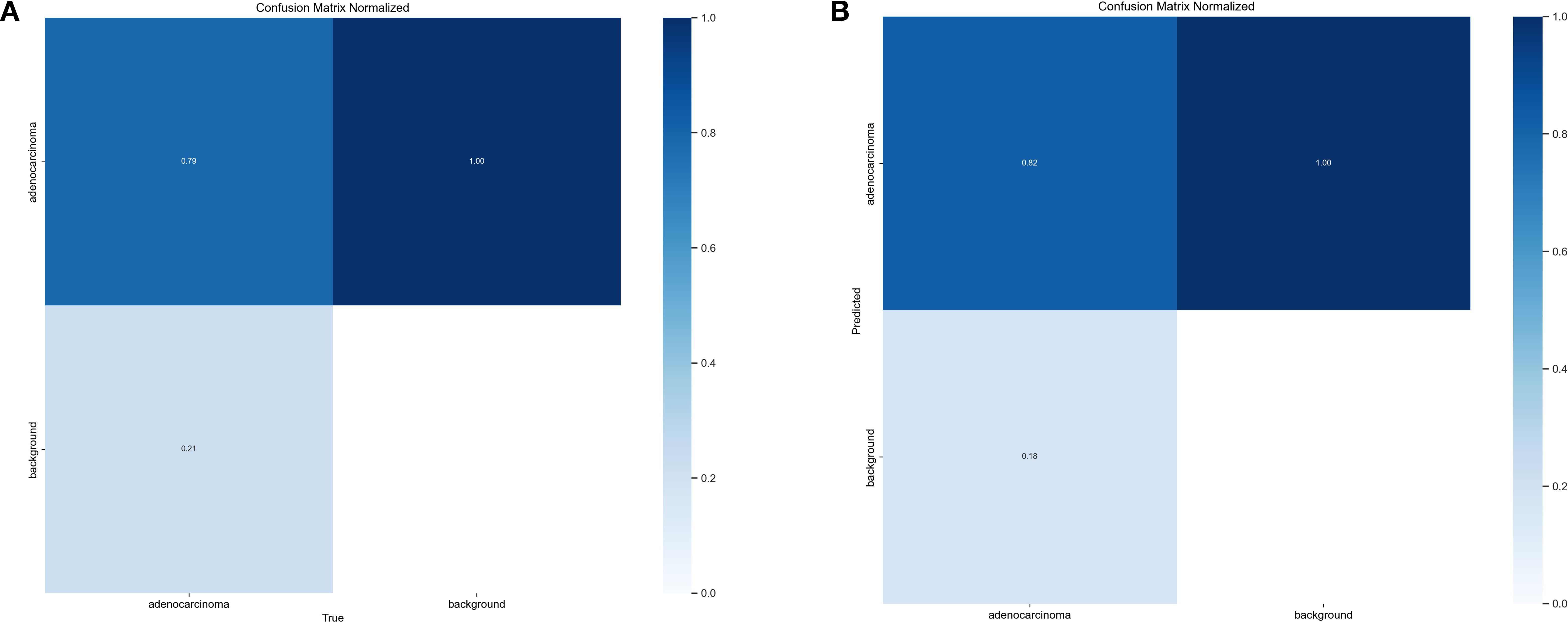 To gain a deeper understanding of FC-YOLO’s diagnostic performance, we conducted a more granular analysis using Precision-Recall (PR) curves. These curves visualize the trade-off between precision and recall across various confidence thresholds, with a curve positioned closer to the top-right corner indicating superior performance. As shown in Figure 9, we compared the PR curves for FC-YOLO and the baseline YOLOv11s on the BOT dataset. The FC-YOLO curve is consistently positioned above the baseline, visually demonstrating that our model achieves higher detection sensitivity while being less prone to making erroneous predictions. We also used confusion matrices to evaluate classification performance by comparing true and predicted labels. In these matrices, superior performance is indicated by higher values along the diagonal and lower values in the off-diagonal cells. Figures 10A,B show the normalized confusion matrices for the baseline YOLOv11s and our FC-YOLO model, respectively, on the BOT dataset. A direct comparison reveals that FC-YOLO achieves higher detection accuracy, identifying gastric adenocarcinoma regions more precisely and with fewer misclassifications. In contrast, the baseline YOLOv11s model shows a higher incidence of both false positives and false negatives.