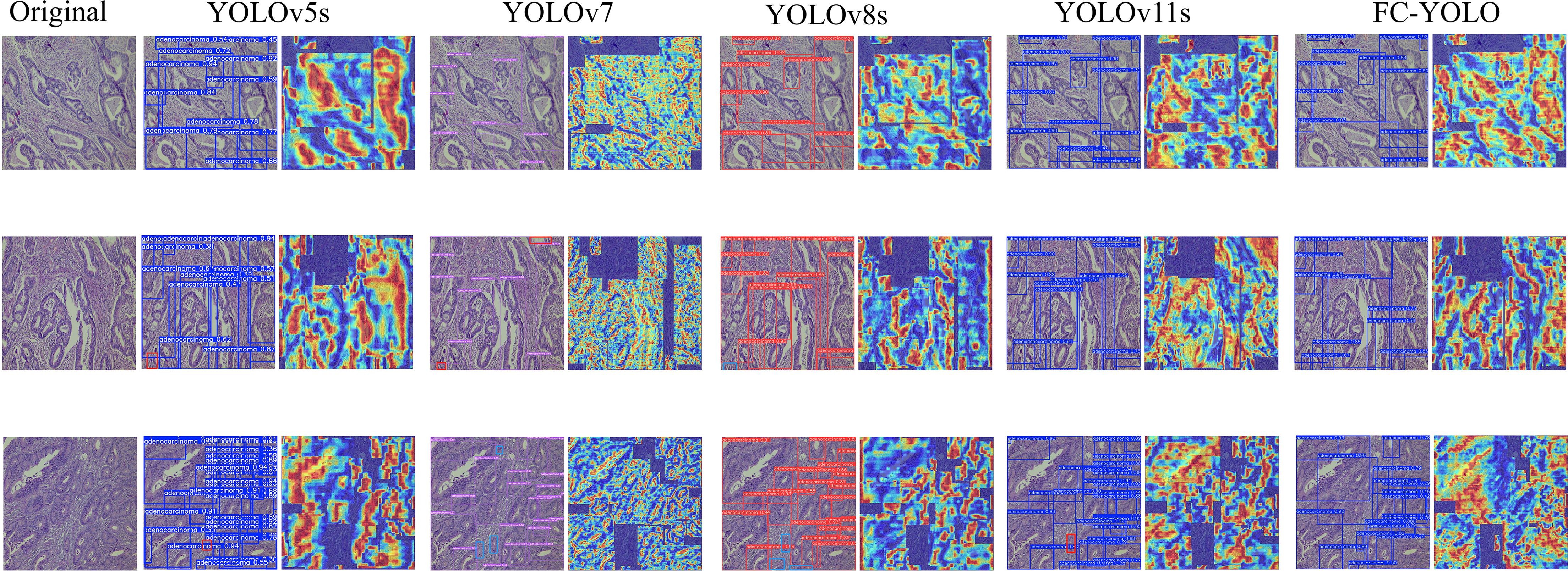 Subsequently, the gastric adenocarcinoma pathological images collected from our hospital were utilized as an In-House Clinical Dataset, on which the model was trained from scratch. The objective was to ascertain whether our model’s enhancements retain their superiority for detecting gastric adenocarcinoma within a real-world clinical environment. A core challenge presented by such independent clinical dataset is the inherent variability in staining protocols and slide preparation. Acknowledging that performing independent stain normalization is often impractical and difficult to maintain consistently in a live clinical workflow, we deliberately omitted this step. Instead, the focus of our evaluation was shifted to assessing the model’s intrinsic robustness against these diverse staining schemes. The trained model was utilized to predict the collected gastric adenocarcinoma slices, and Grad-CAM heatmaps were conducted to verify the regions of interest of our model. Moreover, comparisons were made with yolov5s, yolov7, yolov8s, and yolov11s, which exhibited relatively superior performance in the control experiments, as depicted in Figure 11. It can be observed from the detection maps of different models that YOLOv7 and YOLOv8s present more missed detections during the detection process, especially in regions with complex backgrounds. Some missed detections are also found in YOLOv5s and YOLOv11s, particularly in the detection of small targets. In contrast, our model demonstrates a superior ability in target recognition of gastric adenocarcinoma. From the heatmaps, it can be noticed that the regions that our model focuses on are mostly the cancer cavities and areas with significant cellular atypia, which are more consistent with the characteristics of gastric adenocarcinoma. Furthermore, we also tested the inference speed of FC-YOLO in the clinically collected slices. As presented in Table 9. Different model variants., the inference speed and accuracy of our model surpass those of other YOLO series models.