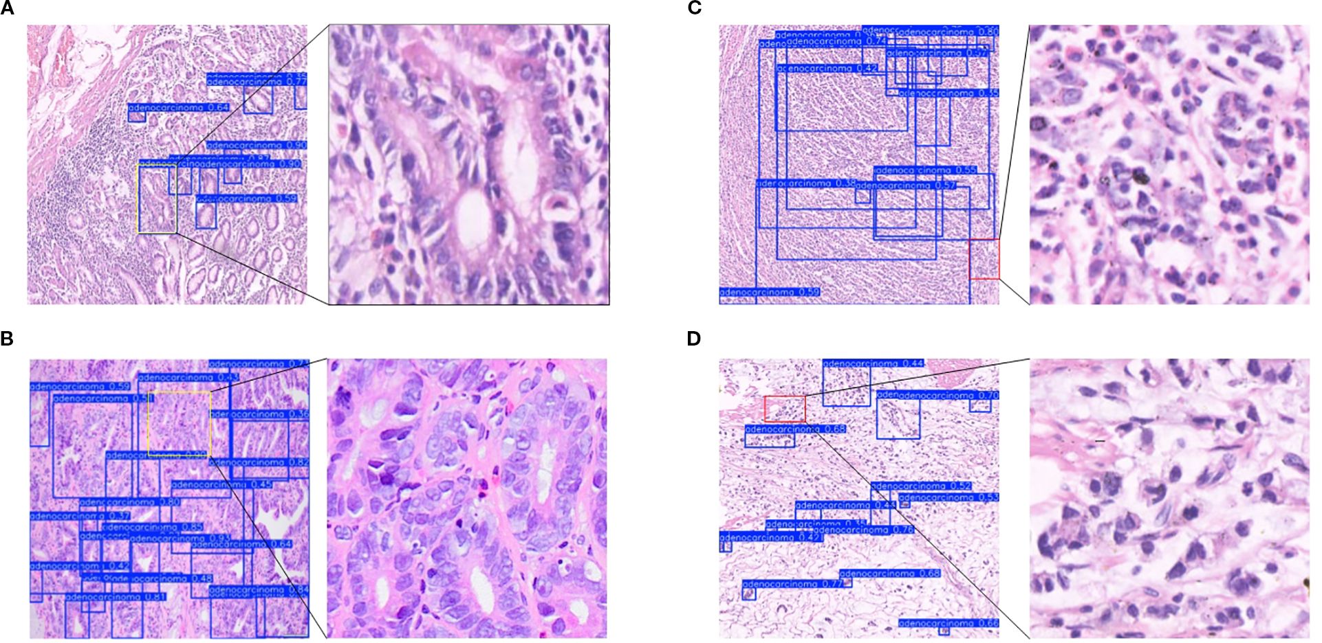 It is noteworthy that our comparative experiments revealed a noteworthy phenomenon: for the specific task of detecting gastric adenocarcinoma, YOLOv5s marginally outperformed its more complex, larger-parameter counterparts, YOLOv7 and YOLOv8s. We hypothesize that this counterintuitive outcome stems from the dataset’s unique characteristics. Architectures like YOLOv7 and YOLOv8s are highly optimized for large-scale, general-purpose datasets such as COCO, but this performance does not always translate to specialized domains like medical imaging. Histopathological images differ significantly from general datasets, as they feature complex tissue backgrounds and high inter-class similarity. In this context, the relative architectural simplicity of YOLOv5s may be more effective at extracting salient features from pathological images. This finding underscores the principle that the most complex model is not invariably the optimal choice for a given application, highlighting the indispensable need for empirical validation tailored to the task at hand, rather than an overreliance on model complexity (42).