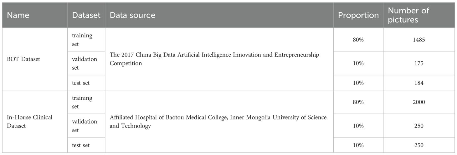 Two distinct datasets were utilized in this study: the BOT Dataset and In-House Clinical Dataset. The BOT Dataset, initially comprising 700 gastric adenocarcinoma images, was expanded to a total of 1,855 images through random data augmentation and preprocessing. This expanded collection, serving as our internal dataset, was subsequently partitioned into training, validation, and test sets at an 8:1:1 ratio, resulting in 1,485 images for training, 175 for validation, and 184 for testing. The In-House Clinical Dataset was constructed from 2,500 pathological images of gastric adenocarcinoma, acquired via microscopic examination from samples of 50 patients at the Affiliated Hospital of Baotou Medical College, Inner Mongolia University of Science and Technology, between 2018 and 2023. This dataset was also partitioned according to an 8:1:1 ratio, yielding 2,000 images for the training set and 250 images each for the validation and test sets. Table 1. provides a detailed summary of this dataset partitioning.