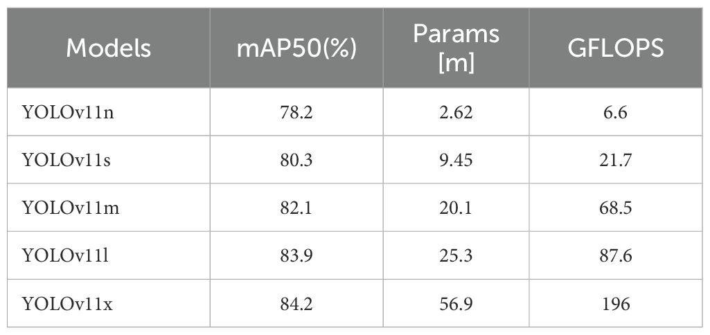 The selection of an appropriate baseline model is a critical step in the development of computer-aided diagnosis systems intended for practical clinical application. Our choice of YOLOv11s as the base architecture was informed by a multi-faceted evaluation of its detection accuracy on pathological images, inference speed, and computational efficiency, the latter being a proxy for deployment feasibility. While numerous YOLO variants exist, such as the widely adopted YOLOv5 and the powerful YOLOv8, we specifically selected YOLOv11 (25).as it represents the latest advancements in optimizing the accuracy-efficiency trade-off for real-time applications. To substantiate this choice, we conducted a preliminary comparative analysis of the YOLOv11 variants (Table 3). This comparison illuminated a fundamental principle: larger models (e.g., YOLOv11m/l/x) deliver superior accuracy but at a substantial computational cost, rendering their deployment impractical in many clinical settings with limited hardware resources. Conversely, the smallest model (YOLOv11n), while highly efficient, lacks the requisite accuracy for high-stakes diagnostic tasks, where a missed detection could have severe consequences. YOLOv11s, however, strikes a judicious balance. It offers a significant improvement in accuracy over YOLOv11n while maintaining a modest parameter count (9.45M) and a low computational load (21.7 GFLOPS). This “sweet spot” is paramount; it establishes a robust performance baseline that is sufficiently high for meaningful clinical assistance, yet efficient enough to permit real-time inference on standard GPUs. This equilibrium makes it an ideal foundation for our subsequent optimizations. Furthermore, compared to other object detection models, YOLOv11s incorporates state-of-the-art architectural improvements, providing an advantageous starting point for the integration of our custom modules: FasterNet, MLCA, and CARAFE. Consequently, YOLOv11s was chosen as the foundational model for our study.