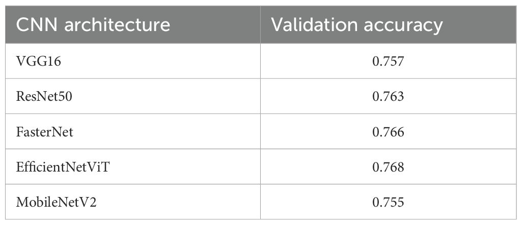 To identify optimal CNN backbone architectures, we conducted a systematic evaluation of classical deep learning models (VGG16 (26). ResNet50 (27). MobileNetV2 (28). FasterNet, and EfficientViT (29)) under standardized experimental protocols. Table 4 presents their validation performance in gastric adenocarcinoma detection tasks with data augmentation. The reported metrics represent mean accuracy scores derived from four-fold cross-validation. A comparative analysis revealed that FasterNet, ResNet50, and EfficientViT demonstrate comparable performance. Consequently, these architectures were selected to replace the backbone component of the YOLOv11 model. A subsequent comparative study was conducted to further investigate which of these CNN architectures is most adept for object detection tasks within the context of histopathological analysis.