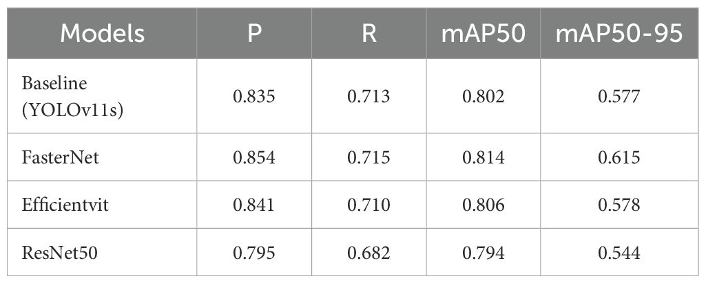 During the training phase, it is crucial to monitor the evolution of precision and recall, while the final training outcomes are assessed using mAP@0.5 and mAP@[0.5:0.95]. These metrics offer valuable insights into a model’s performance and its generalization capability. As detailed in Table 5 and Figure 5, we evaluated three high-performing backbone networks—FasterNet, EfficientViT, and ResNet50—by substituting them into the YOLOv11s architecture. The analysis of the results indicates that, compared to the baseline version, the FasterNet substitution yielded the most favorable performance. Specifically, it achieved a 1.2% increase in mAP and a 1.9% improvement in accuracy. Consequently, based on these findings, FasterNet was definitively selected as the backbone for our model.