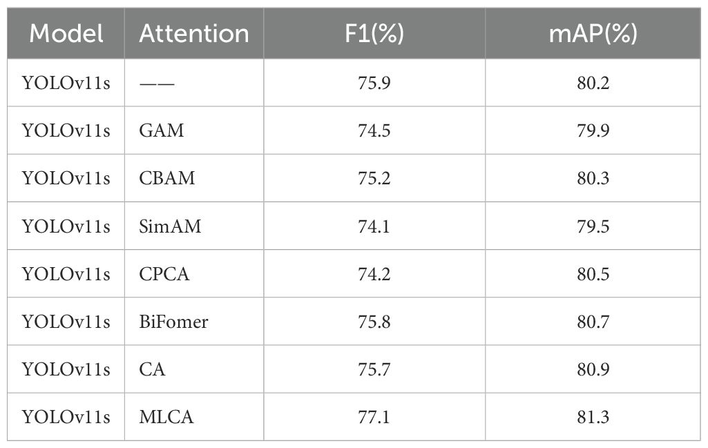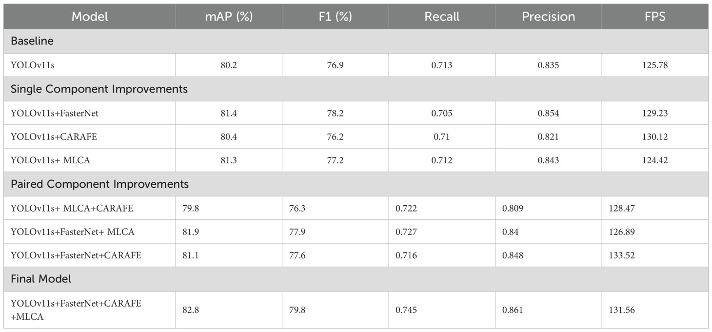 We conducted ablation experiments to validate the impact of our three proposed improvements. As detailed in Table 7, we evaluated eight experimental configurations by comparing them against the baseline YOLOv11s model. The performance of each configuration was assessed using mAP, F1-score, Recall, and Precision. We designated the modified configurations based on the added components—for example, “YOLOv11s+FasterNet” for the FasterNet backbone, “YOLOv11s+CARAFE” for the CARAFE upsampling module, and “YOLOv11s+MLCA” for the MLCA attention mechanism. This naming pattern was applied consistently across all combinations.