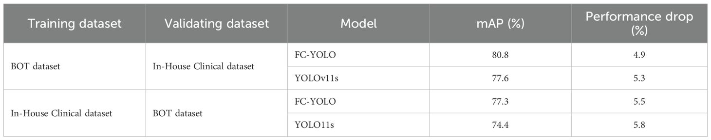 To rigorously evaluate the generalizability and robustness of our proposed FC-YOLO model, we conducted a cross-dataset validation experiment. This experiment utilized our two independent datasets: the BOT dataset and an In-House Clinical dataset. Both FC-YOLO and the baseline YOLOv11s adhered to a strictly consistent cross-validation protocol. In the first arm, models were trained exclusively on the BOT dataset and then directly evaluated on the validation set of the In-House Clinical dataset. Conversely, in the second arm, models were trained solely on the In-House Clinical dataset and subsequently assessed on the BOT dataset’s validation set.