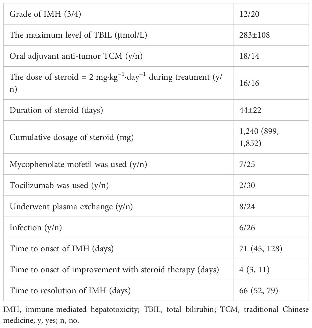 The clinical characteristics of 32 severe IMH patients, with 12 patients of grade 3 and 20 patients of grade 4 severity, according to CTCAE, are presented in Table 2. The onset of IMH occurred at a median of 71 days (IQR, 45, 128 days) following the initiation of ICI therapy. The average value of the highest TBIL level was 283±108 um/L. Additionally, 18 patients reported concurrent oral use of traditional Chinese medicine (TCM) (including cinobufacin, Xihuang pill, and Marsdenia tenacissima) during their ICI treatment.