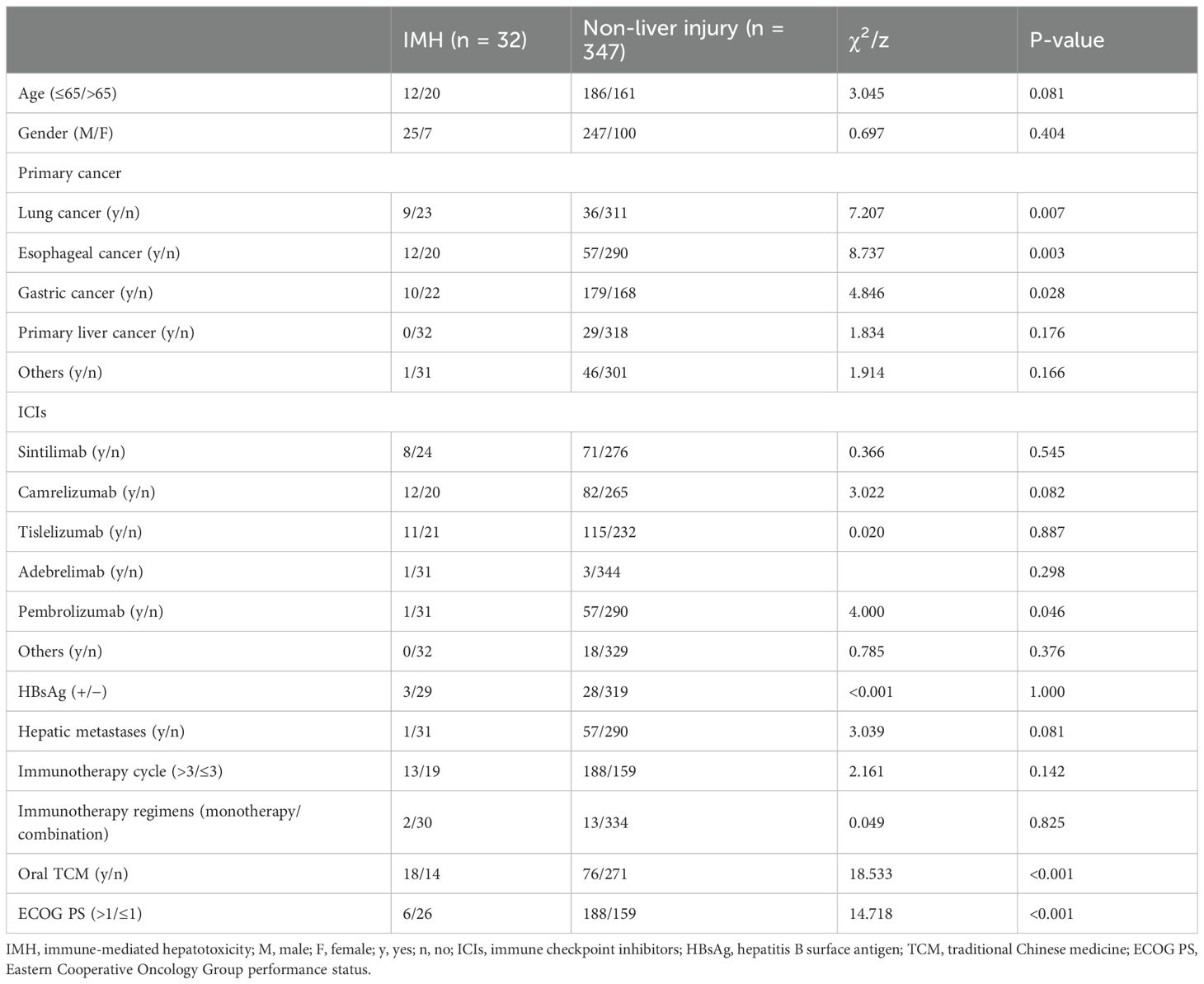 A total of 348 cancer patients who received immunotherapy in our department were screened, with one case fitting the severe IMH criteria, while the other 31 cases that transferred to our department for IMH treatment, following the diagnosis of severe IMH, were also included in the present analysis. The ICIs used in the present cohort consisted of 375 cases of anti-PD-1 antibodies (including sintilimab, camrelizumab, tislelizumab, pembrolizumab, toripalimab, and serplulimab) and four cases of anti-PD-L1 antibody therapy (adebrelimab). The incidence of severe IMH was the highest in lung cancer patients, with nine cases occurring out of 45 patients (20%), followed by esophageal cancer patients at 17.4% (12 out of 69 patients) and gastric cancer at 5.3% (10 out of 189 patients). The median age for the total patients was 65 years (IQR, 57, 71 years), comprising 272 men and 107 women, but the median age of severe IMH patients was 69 years (IQR, 59, 73 years), comprising 25 men and seven women. Among these patients, 15 patients received ICI monotherapy, whereas 364 patients received ICI therapy combined with chemotherapy or targeted therapy. Some patients presented with basic liver diseases, with 53 cases of liver metastasis and 31 cases of concurrent hepatitis B virus infection at the initiation of ICI therapy, but all patients displayed preserved hepatic function (Table 1).