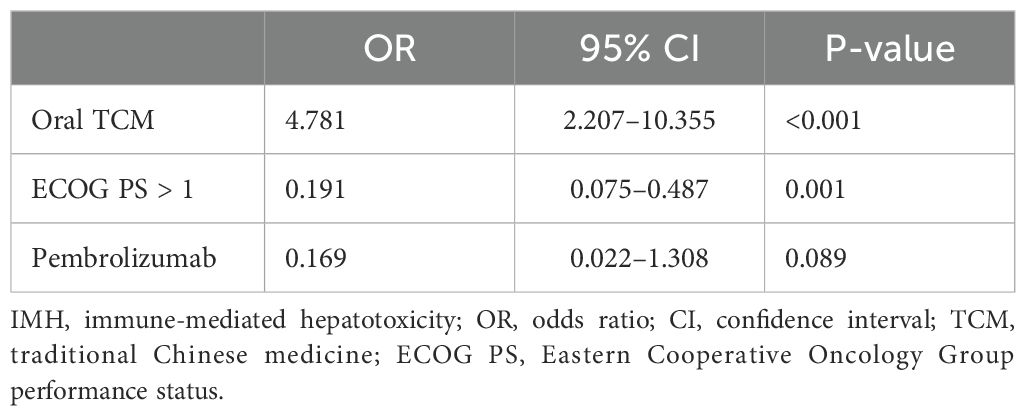 The present study had several limitations. First, it was a retrospective single-center study with a small sample size. Second, due to the limited sample size, we were unable to analyze potential correlations between factors associated with the occurrence of irAEs—such as family history of autoimmune diseases, prior episodes of other irAEs, use of proton pump inhibitors or metformin, and the development as well as treatment outcomes of IMH. These associations will be further explored in subsequent studies with larger sample sizes. Third, the overrepresentation of certain cancer types (e.g., lung, esophageal, and gastric cancers) in the cohort introduces a notable selection bias, although this variable was not included in the multivariate analysis. Given the limitation of sample size, this study inevitably carries the risk of confounding biases, particularly concerning the two clinical characteristics of TCM usage and ECOG PS scores. Fourth, due to the validity of the sample size, we were unable to conduct an internal validation of the ROC curve’s AUC of 0.923 to assess its stability. Fifth, there was an absence of histological analysis for all IMH patients to guide diagnosis and treatment. The necessity of liver biopsy in severe IMH cases remains controversial. According to the current NCCN guidelines for irAE management, the diagnosis of IMH is primarily one of exclusion. Liver biopsy should be conducted only when deemed absolutely necessary (on rare occasions) and not as a routine diagnostic measure (18). Furthermore, limited data exist regarding the histopathologic findings specific to IMH, and no pathognomonic features have been identified, thereby limiting the diagnostic utility of liver biopsy (33–35). Finally, given the invasive nature and associated risks of liver biopsy, it was selectively performed in this study only on patients with steroid resistance to guide further therapeutic strategies.