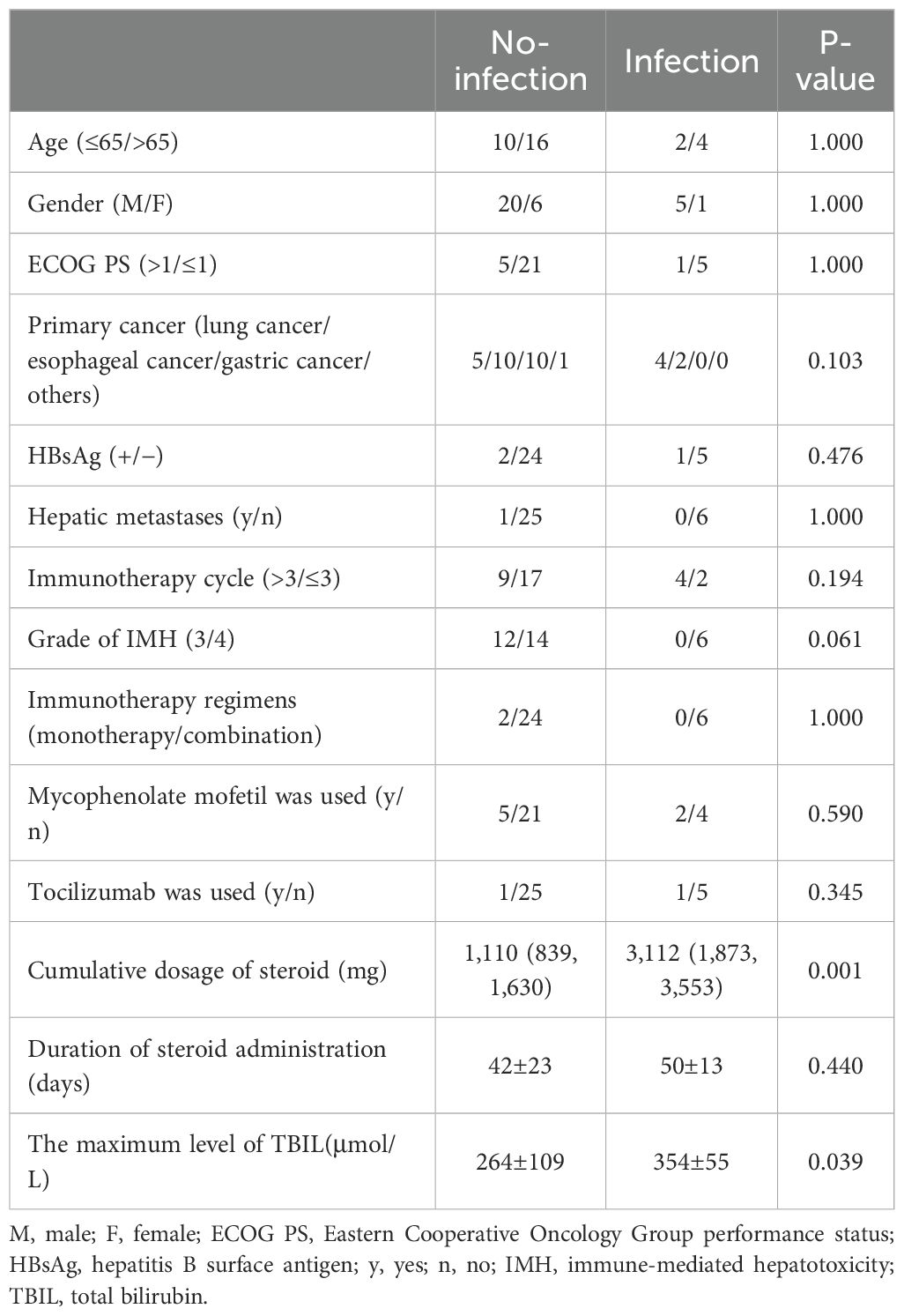 The multiple guidelines for managing IMH from the American Society of Clinical Oncology (ASCO) (14) and the National Comprehensive Cancer Network (NCCN) (18) were recommended, but all current recommendations are mainly based on expert consensus rather than evidence-based medicine (19). There remains a notable lack of real-world studies to evaluate the risk factors, clinical progression, and particularly the treatment experience [the optimal timing of steroid administration, the assessment of steroid resistance, the timing and practical value of liver biopsy, and the appropriate time point for plasma exchange (PE)] (20). While several small-sample studies have investigated the risk factors for severe IMH, the results are not consistent regarding clinical application (17–19). To identify the risk factors associated with the development of severe IMH and to evaluate the treatment decisions for this condition, we conducted a retrospective analysis of cancer patients who developed severe IMH following ICI treatment.