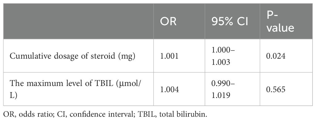 The infection rate among severe IMH patients receiving steroid treatment was 18.8%, including cytomegalovirus, novel coronavirus, and P.c. (Supplementary Table S1). Among the first 20 severe IMH patients, three cases of P.c. pneumonia were observed, resulting in one death. Under the condition of TBIL reduction upon steroid treatment, a prophylactic treatment of trimethoprim–sulfamethoxazole was performed for later severe IMH patients whose total steroid dosage reached the cutoff value of 1,656 mg. It did not induce excessive hepatotoxicity when patients’ TBIL was reduced to a median level of 166.9 μmol/L.