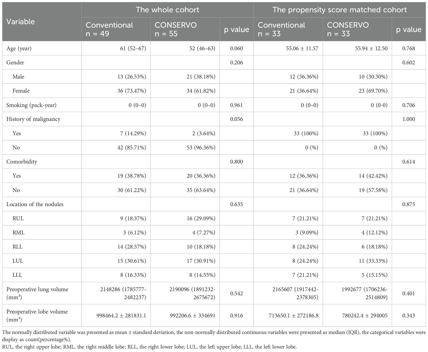 A total of 104 patients were included in the analysis: 49 in the stapler group and 55 in the CONSERVO group. Baseline characteristics, including age, sex, smoking history, comorbidities, prior malignancy, and nodule location, were well balanced between the groups. There were also no significant differences in tumor size or preoperative CT-based lung and nodule-residing lobe volumes. The was no baseline imbalance between the propensity score matched groups either (Table 1).