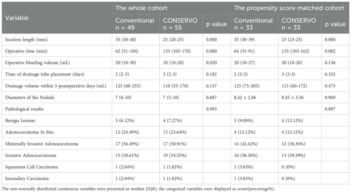 None of the patients included have experienced postoperative complications. The CONSERVO group demonstrated a longer operative time compared to the stapler group (median and IQR, 133 minutes [103–170 minutes] vs. 62 minutes [51–104 minutes], p < 0.001), consistent with the technical demands of electrosurgical dissection and suturing. However, CONSERVO technique was associated with a significantly smaller incision length (median and IQR. 23 mm [20-25mm] vs. 35 mm [30-40mm], p < 0.001) and fewer intraoperative bleeding (median and IQR, 10 mL [10-20mL] vs. 20 mL [10-30mL], p = 0.020). No statistically significant differences were observed in chest tube duration or total drainage volume during the first three postoperative days. There were no intraoperative complications or conversions to anatomical resection in either group. In the propensity score matched groups, the differences of the operative time consumption (median and IQR, 133 minutes [103–162 minutes] vs. 64 minutes [51–91 minutes], p = 0.002) and the length of incision (median and IQR, 23 mm [23-25mm] vs. 35 [30-39mm], p <0.001) remained, but the difference of intraoperative bleeding (median and IQR, 20 mL [10-20mL] vs. 20 mL [10-27mL], p=0.136) did not.