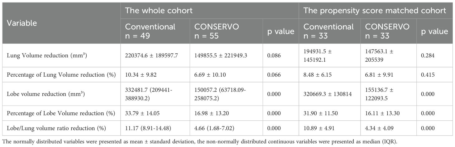 The CONSERVO group exhibited substantially less parenchymal loss, i.e., lobe/lung volume ratio loss (median and IQR, 4.66% [1.68–7.02%] vs. 11.17% [8.91–14.48%], p < 0.001) and lobe volume loss (median and IQR, 150057.2mm3 [63718.09-258075.2mm3] vs. 332481.7mm3 [209441-388930.2mm3], p<0.001). However, the total lung volume loss (mean and SD, 149855.5 ± 221949.3 mm³ vs. 220374.6 ± 189597.7 mm³, p = 0.086) only showed a non-significant trend favoring CONSERVO technique. In the PSM analysis, the lung volume-preserving effects of the CONSERVO technique compared to stapler-based resection remained statistically significant: lobe/lung volume ratio loss (mean and SD, 4.34 ± 4.09% vs. 10.89 ± 4.91%, p<0.001) and lobe volume loss (mean and SD, 155136.7 ± 122093.5mm3 vs. 320669.3 ± 130814mm3, p<0.001) (Table 3).