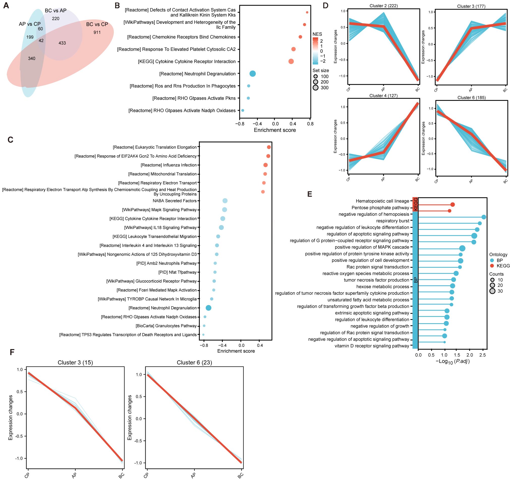 Figure 1. Analysis of differentially expressed genes of CML progression from initial CP to AP and terminal BC. (A) Scaled Venn diagram depicting the DEGs identified in each transition. (B, C) Gene Set Enrichment Analysis (GSEA) for the transition from (B) chronic phase to accelerated phase (CP vs. AP) and (C) accelerated phase to blast crisis (AP vs. BC). (D) Trend analysis of the 1294 differentially expressed genes (AP vs CP plus BC vs AP, overlaps removed) to illustrate the changes across CP, AP, and BC stages. (E) GO and KEGG enrichment analyses of the consistently trending genes in (D) illuminate the key pathways driving progression. (F) Trend analysis of the 102 differential genes shared between CP vs AP and AP vs BC.