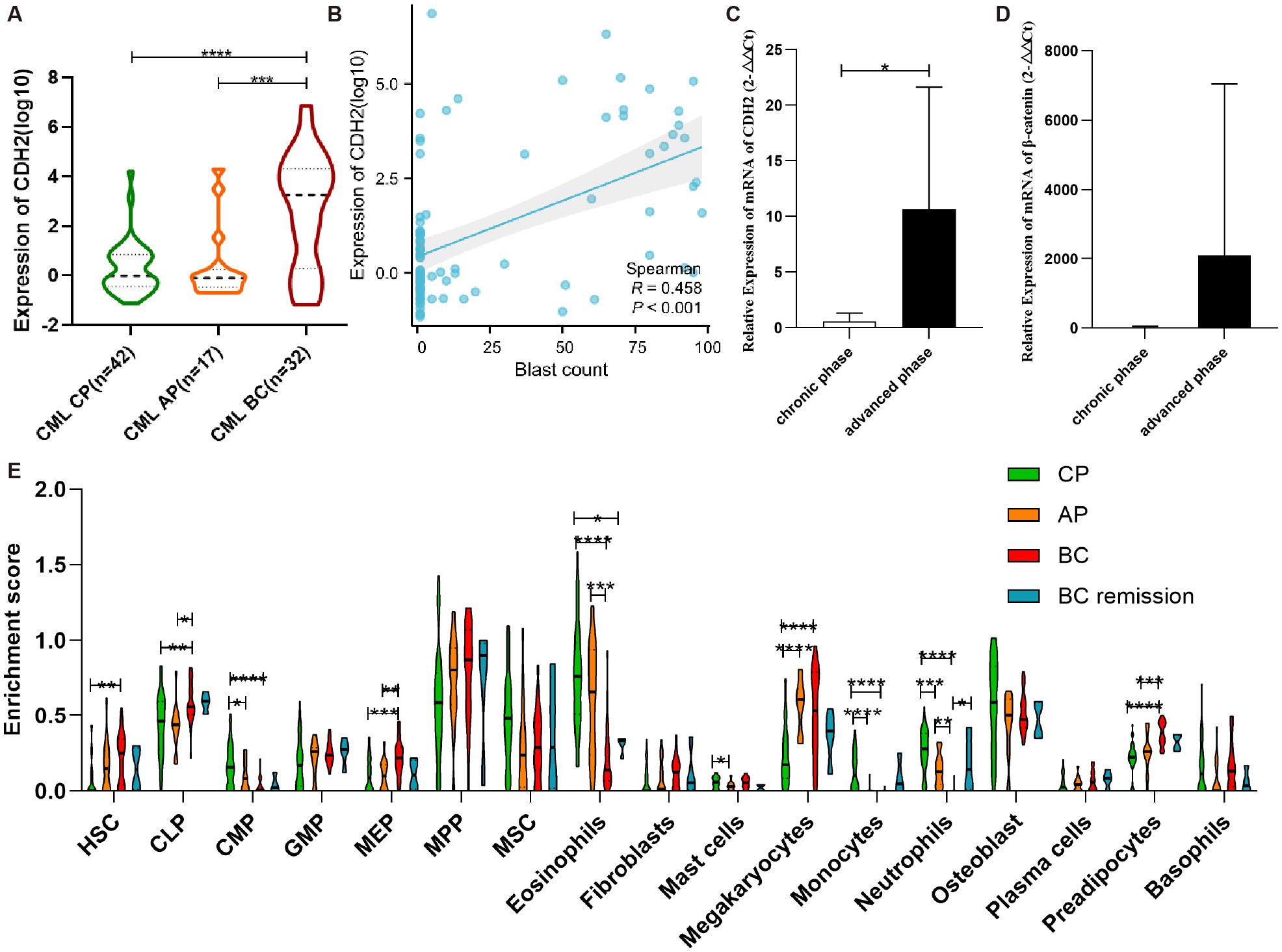 Figure 2. N-cadherin expression and immune infiltration in CML progression. (A) Expression trend of N-cadherin across chronic phase (CP), accelerated phase (AP), and blast crisis (BC) from GSE4170. CML-CP (n = 42) vs CML-AP (n = 17) vs CML-BC (n = 32). CP vs BC: p < 0.0001, Cohen’s d = 1.41; AP vs BC: p = 0.0004, Cohen’s d = 1.14. (B) The scatter plot illustrating the correlation between blasts and N-cadherin expression in CML. (C, D) Increased expression of (C) N-cadherin and (D) β-catenin in individuals with advanced phase of CML. CML-CP (n = 7) vs CML-AP/BC (n = 7). (C): p = 0.0323, Cohen’s d = 1.29; (D): p = 0.29, Cohen’s d = 0.60. (E) Analysis of immune infiltration in four cohorts of CML. CP (n = 42), AP (n = 17), BC (n = 28), BC -remission (n = 4). For HSC: η2p = 0.13; CP vs BC (p = 0.0029). For CLP: η2p = 0.15; CP vs BC (p = 0.0052), AP vs BC (p = 0.0015). For CMP: η2p = 0.27; CP vs AP (p = 0.031), CP vs BC (p < 0.0001). For MEP: η2p = 0.19; CP vs BC (p = 0.0005), AP vs BC (p = 0.0049). For Eosinophils: η2p = 0.40; CP vs BC (p < 0.0001), CP vs. BC remission (p = 0.024), AP vs BC (p = 0.0003). For Mast cells: η2p = 0.11; CP vs AP (p = 0.031). For Megakaryocytes: η2p = 0.30; CP vs AP (p < 0.0001), CP vs. BC remission (p < 0.0001). For Monocytes: η2p = 0.30; CP vs AP (p < 0.0001), CP vs. BC remission (p < 0.0001). For Neutrophils: η2p = 0.51; CP vs AP (p = 0.001), CP vs. BC (p < 0.0001), AP vs BC (p = 0.0015), BC vs. BC remission (p = 0.034). For Preadipocytes: η2p = 0.37; CP vs. BC (p < 0.0001), AP vs BC (p = 0.0006). (A, C, D): Data were analyzed using an unpaired two-tailed Student’s t-test. (E): Data were analyzed using one-way ANOVA followed by Tukey’s post hoc test. Data are presented as mean ± SD.*p < 0.05, **p < 0.01, ***p < 0.001, ****p < 0.0001.