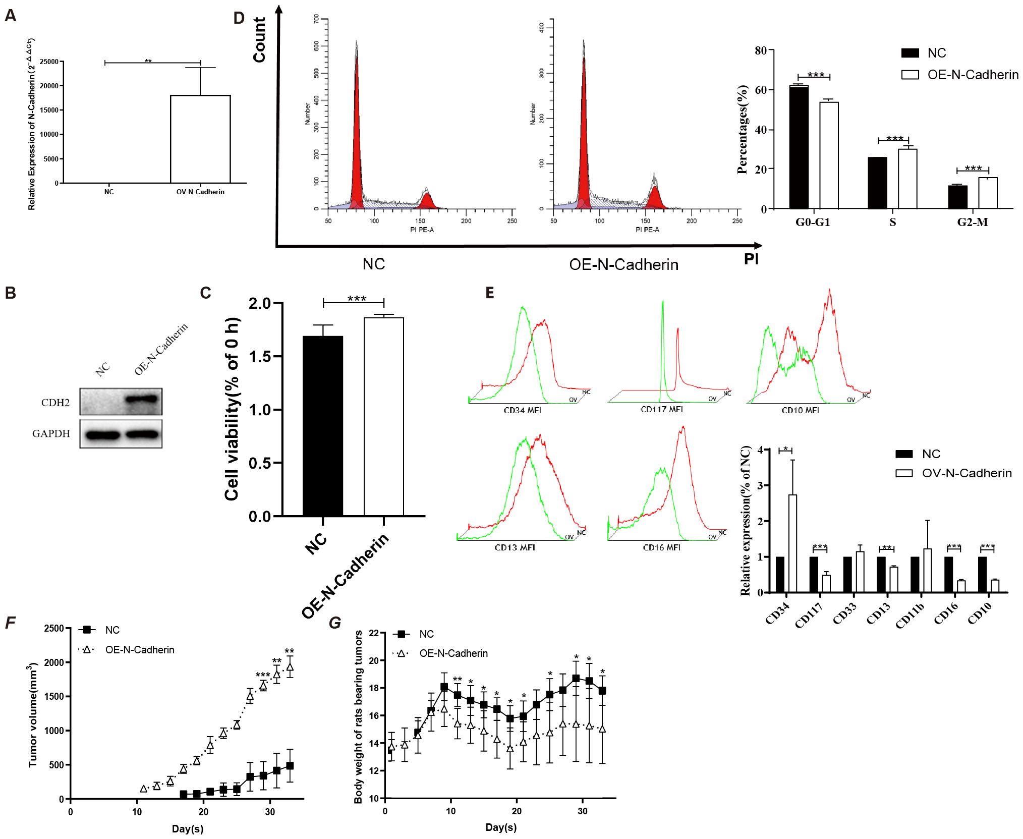 A scientific figure with multiple panels related to N-Cadherin overexpression:  A. Bar graph showing increased expression of N-Cadherin in overexpressed (OE) group compared to control (NC).  B. Western blot of CDH2 (N-Cadherin) and GAPDH in NC and OE-N-Cadherin conditions.  C. Bar graph displaying cell viability percentages; OE-N-Cadherin group shows higher viability.  D. Flow cytometry histograms and bar graph showing cell cycle distribution; significant differences observed between NC and OE-N-Cadherin.  E. Flow cytometry on various CD markers; histograms and bar graph show altered expression levels.  F. Tumor volume growth curves over thirty days, comparing NC and OE-N-Cadherin groups.  G. Line graph of body weight over time for rats bearing tumors, contrasting NC and OE-N-Cadherin groups.