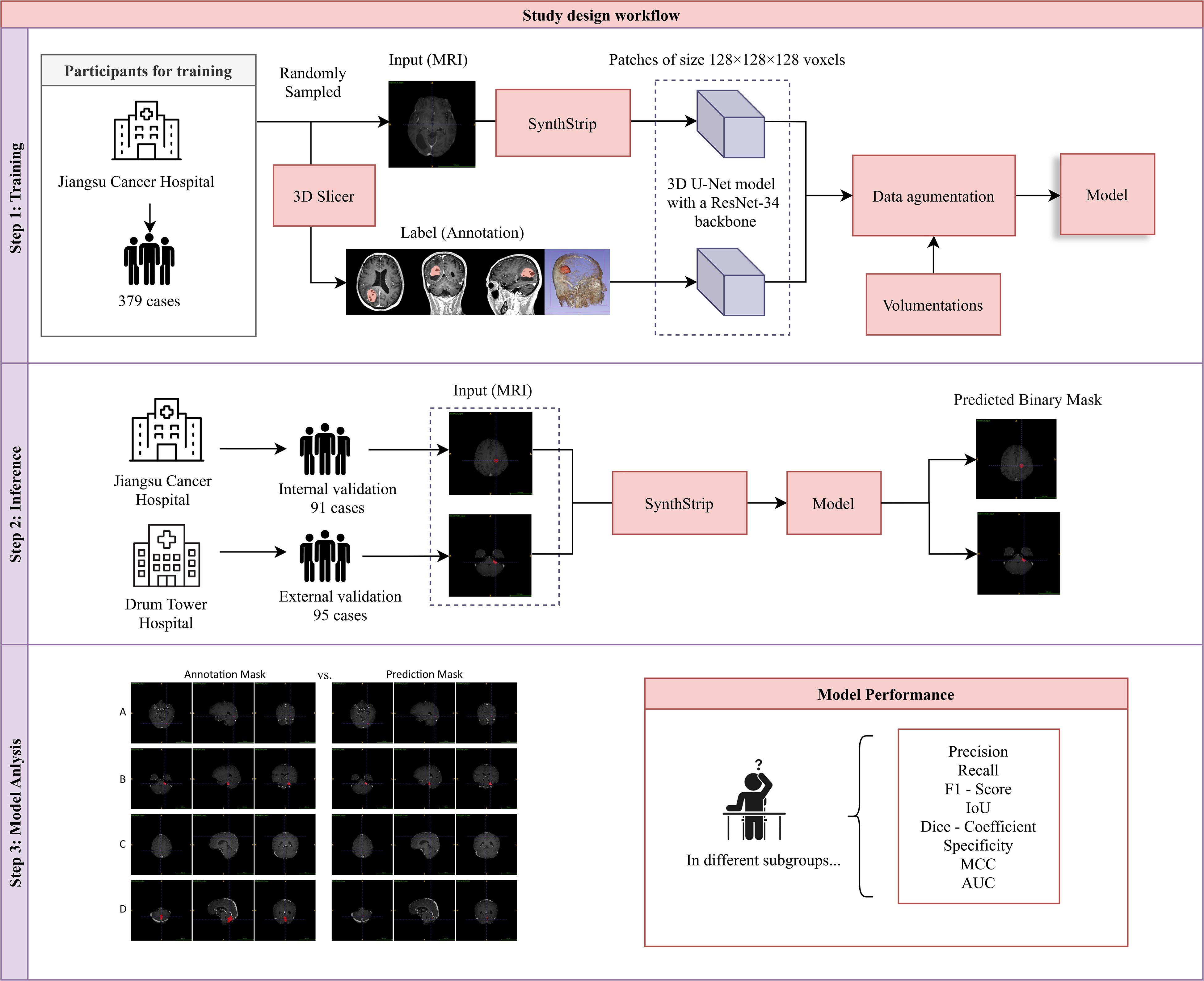 Figure 1. Study design workflow. Our study comprised three sequential phases: (1) Model Training: A 3D U-Net model with a ResNet-34 backbone was trained on the training dataset. (2) Inference: The model’s performance was evaluated using an internally curated testing set from the same hospital and an external validation set from another hospital. (3) Model Evaluation: Eight metrics were calculated to assess model performance, and a comparative analysis between model-based and manual delineations was conducted.