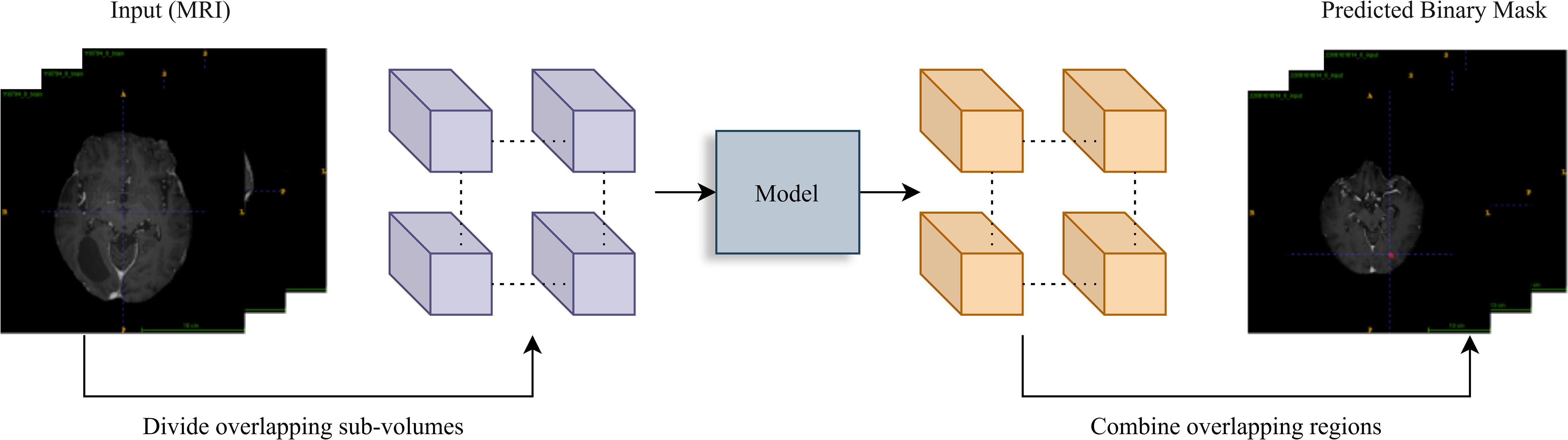Figure 2. Inference workflow. A sliding window (stride=64) divides the input MRI volume into overlapping sub-volumes. Each is processed by the trained model for prediction. Overlapping region outputs are averaged to reconstruct the final binary tumor segmentation mask, ensuring smooth transitions.