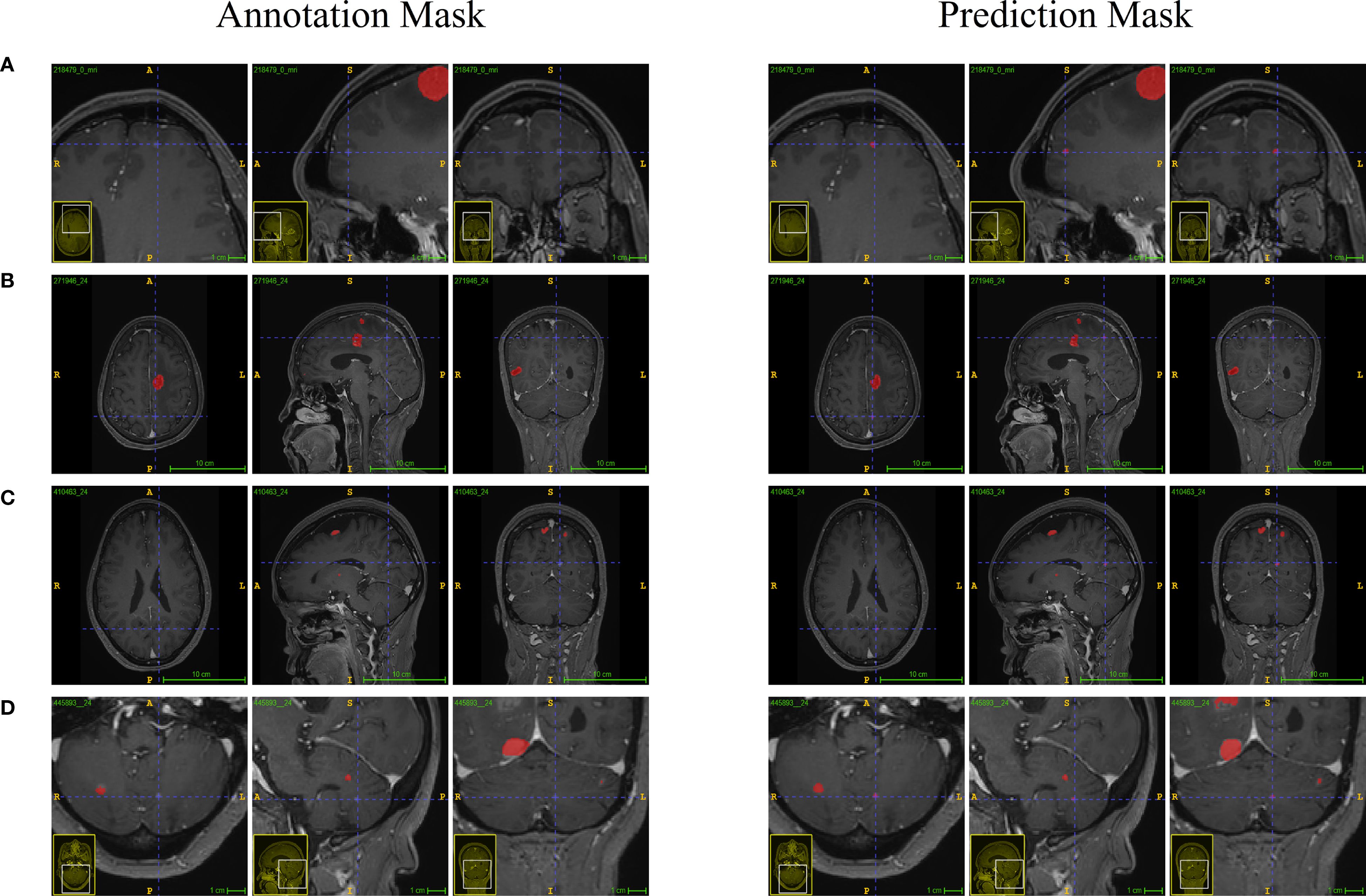 One of the most commonly used network architectures is the so-called U-Net (26, 27). Recently, Pfluger I et al. developed a system based on artificial neural networks (28) using the nnU-Net method to segment meningiomas from 308 patients (29). Bousabarah K et al. implemented traditional U-Net and an improved U-Net with multiple outputs to achieve automatic separation of meningiomas (30). Additionally, Gong J et al. proposed an integrated learning model based on deep learning and image-based radiomics to improve the prediction ability of the risk of brain metastasis in patients with advanced non-small cell lung cancer within three years (31). By applying the deep residual U-Net model, each pulmonary tumor can be automatically and accurately segmented, combined with CT image-based radiomics and clinical features. This improves the performance of predicting the risk of meningiomas. We also found that the quality of automatic segmentation is very high (0.8≥DSC≥0.6) in both the internal test set and external validation set, indicating that the model can provide more reliable image segmentation for brain metastases. Zhu Genste et al. trained a deep learning model for detecting and three-dimensional segmenting brain metastases in non-small cell lung cancer (32). Compared with manual segmentation, the DSC consistency coefficient reached 0.72.