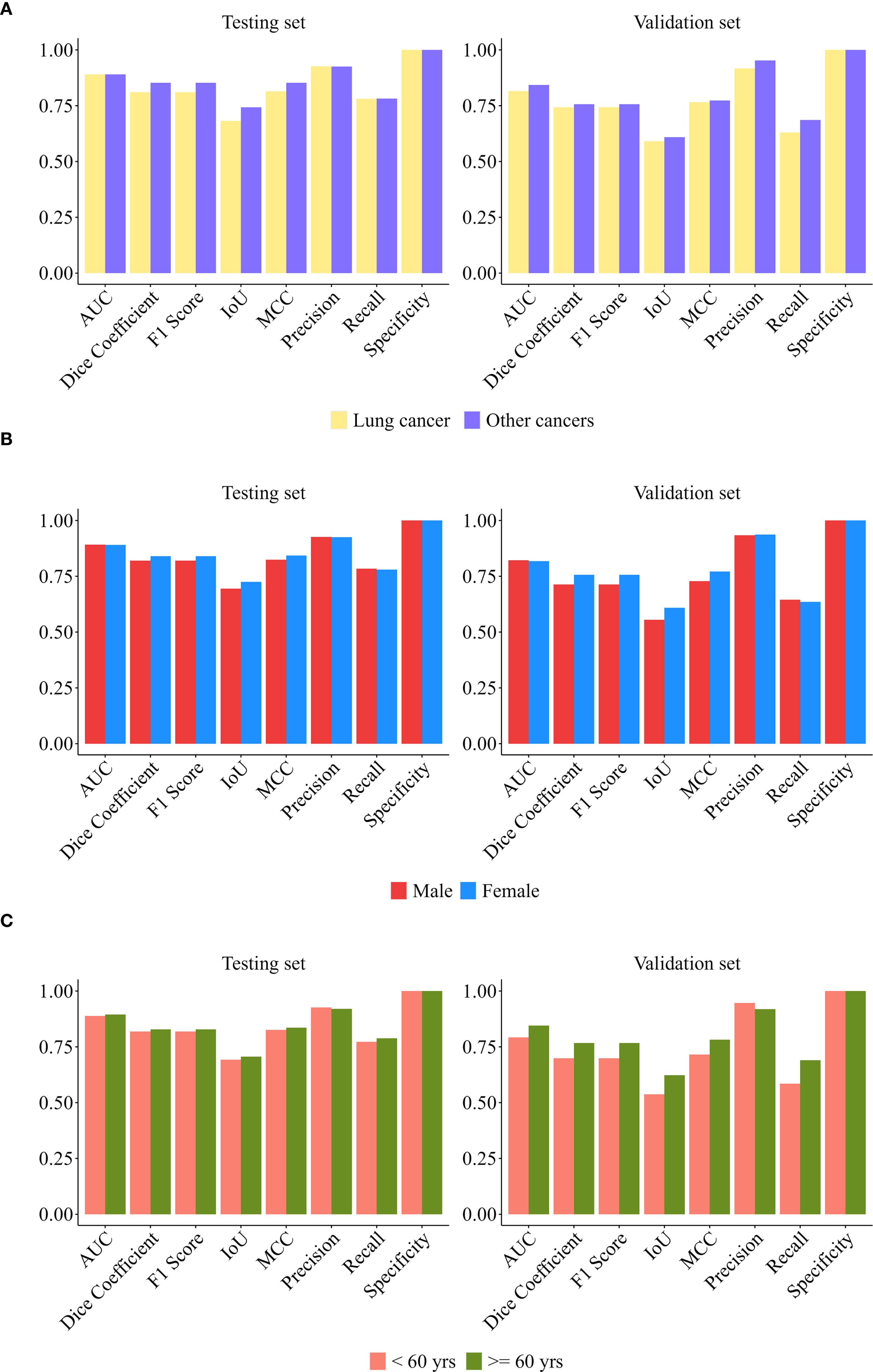 Most previous studies used classical machine learning or deep learning and multiple sequences to detect or segment brain metastases based on the number and size of the lesions (33, 34). Although these studies mostly evaluated overall sensitivity, accuracy, and per capita false positive rate, they covered various different primary tumor subtypes. Although multi-modal modalities have significant advantages, the additional scanning time and sequence availability costs may hinder their widespread clinical application. Our method uses only the CE TIWI sequence and can detect brain metastases with a precision of over 80%. Given the trade-off between precision and specificity, our model may be more suitable for wide clinical application. Unlike previous studies, this research validates the model through multi-dimensional hierarchical validation, firmly confirming that the model is not affected by factors such as gender and age, supporting its universality in patients of different ages and genders. Although this model shows certain type-dependent performance in the cancer type dimension for the identification of lung cancer and other cancers, its efficiency has significantly improved and the overall performance is quite good, demonstrating good potential for clinical translation applications.