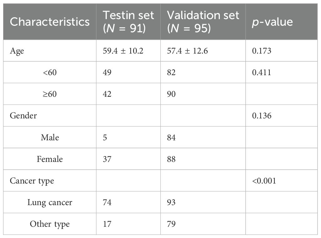 This retrospective study included 91 patients in the test set and 172 patients in the validation set. The median baseline ages in the test and validation sets were 59.4 ± 10.2 and 57.4 ± 12.6 years, respectively. Demographic and clinical characteristics, including age and gender, were comparable between the two cohorts, with no statistically significant differences observed. Selection bias was present regarding cancer type, showing a statistically significant difference. The clinical characteristics of the patients are summarized in Table 1.