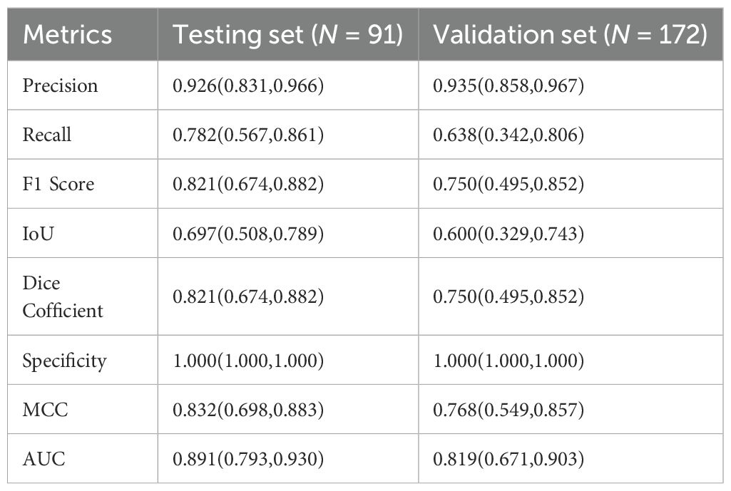 Table 2 describes the case characteristics in the internal test set and external validation set. In our study, model performance on both the internal test set and external validation set was evaluated by calculating Precision, Recall, F1 Score, Intersection over Union (IoU), Dice Coefficient, Specificity, Matthews Correlation Coefficient (MCC), and the Area Under the Receiver Operating Characteristic Curve (AUC). Results were summarized using median and interquartile range (IQR) (Table 2). The results showed that the model achieved an AUC of 0.89 (IQR 0.79–0.93) on the internal test set and 0.82 (IQR 0.67–0.90) on the validation set, indicating good overall diagnostic capability. Furthermore, Precision was >0.93 in both the internal test set and external validation set, suggesting strong discriminative ability, with the external validation set showing higher precision than the test set. Recall decreased from 0.78 (IQR 0.57–0.86) in the test set to 0.64 (IQR 0.34–0.81) in the validation set, accompanied by a synchronous decline in F1 Score (0.82 vs. 0.75), indicating moderate model robustness. Specificity reached 1.000 (IQR 1.000–1.000) in both the test and validation sets, signifying theoretically optimal ability to exclude negative samples. MCC decreased to 0.77 (IQR 0.55–0.86) in the validation set, indicating good classification reliability; the Dice Coefficient also decreased synchronously to 0.75 (IQR 0.49–0.85).