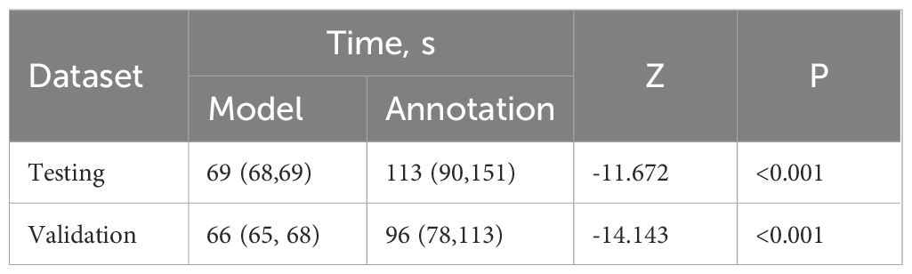 Table 3. Comparison of time consuming in model-based and manual annotation in internal testing set and external validation set.