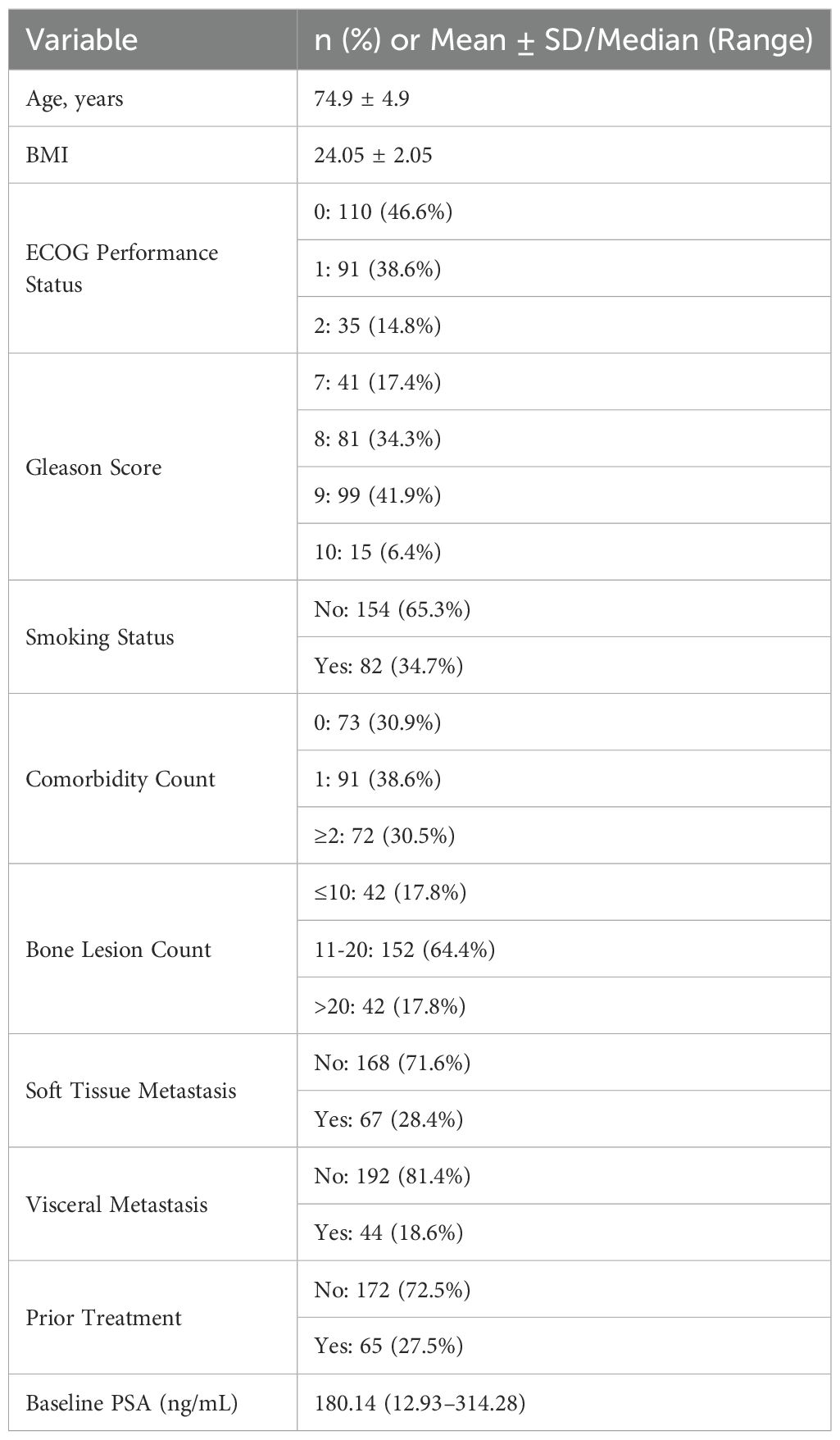 A total of 236 patients with high-volume metastatic hormone-sensitive prostate cancer (mHSPC) were included in this multicenter retrospective study. The mean age was 74.9 ± 4.9 years, and the mean BMI was 24.05 ± 2.05 kg/m². ECOG performance status was 0 in 46.6% of patients, 1 in 38.6%, and 2 in 14.8%. Gleason score distribution was as follows: 17.4% (score 7), 34.3% (score 8), 41.9% (score 9), and 6.4% (score 10). A history of smoking was reported in 34.7% of patients, and 69.1% had at least one comorbidity (Table 1).