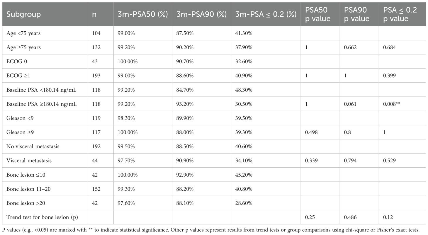 Efficacy endpoints (including rates of PSA50, PSA90, and PSA ≤0.2 ng/mL at 3 months) were summarized for the entire cohort and for predefined subgroups (age, ECOG, baseline PSA, Gleason score, visceral metastasis, bone lesion count). Differences in efficacy outcomes between subgroups were assessed using chi-square or Fisher’s exact tests, with trend tests for ordinal variables where applicable.