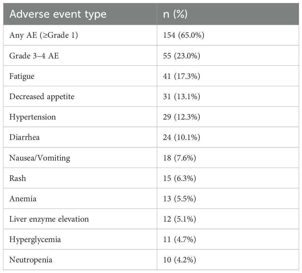 Among the safety population, 65% of patients experienced at least one adverse event (AE) of any grade, and 23% experienced grade 3–4 AEs (Table 5). The most common AEs included fatigue (17.3%), decreased appetite (13.1%), hypertension (12.3%), diarrhea (10.1%), nausea or vomiting (7.6%), rash (6.3%), anemia (5.5%), elevated liver enzymes (5.1%), hyperglycemia (4.7%), and neutropenia (4.2%). No unexpected safety signals were observed, and the regimen was well tolerated overall.