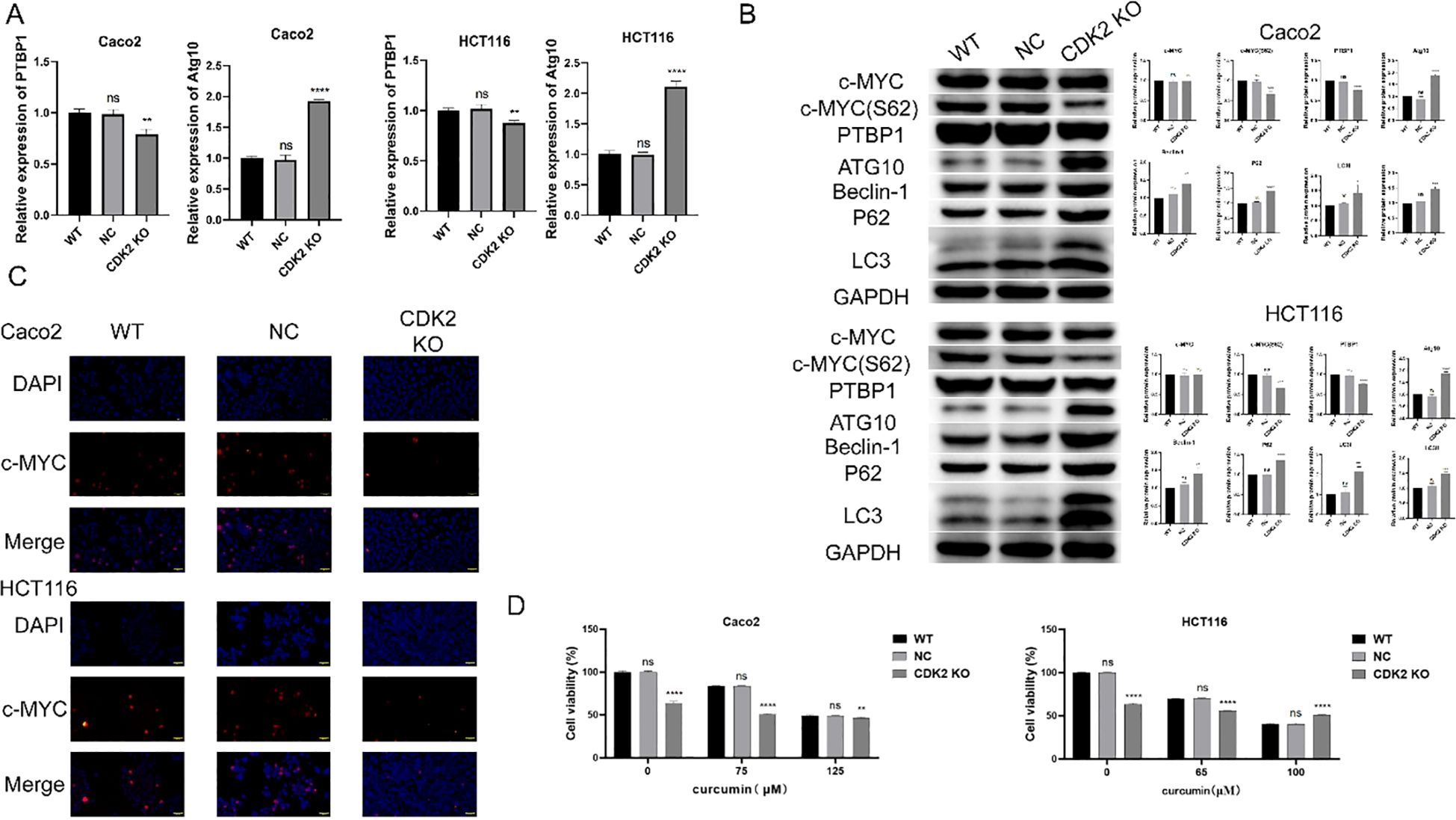 Figure 5. Molecular changes associated with CDK2 knockout. (A) PCR results show that CDK2 knockout and curcumin treatment significantly reduce PTBP1 mRNA levels while increasing Atg10 mRNA levels in both cell lines. (B) Western blot analysis shows that CDK2 knockout and curcumin treatment reduce PTBP1 protein levels and c-MYC S62 phosphorylation, with an increase in autophagy-related proteins (Atg10, Beclin-1, P62, LC3). (C) Immunofluorescence analysis shows altered nuclear localization of c-MYC following CDK2 knockout and curcumin treatment. (D) CCK8 assays show that CDK2 knockout reduces cell sensitivity to curcumin treatment in both CaCo2 and HCT116 cells. ns, p > 0.05; *p < 0.05; **p < 0.01; ***p < 0.001; ****p < 0.0001. Data are presented as mean ± SD, n = 3 for each experiment.