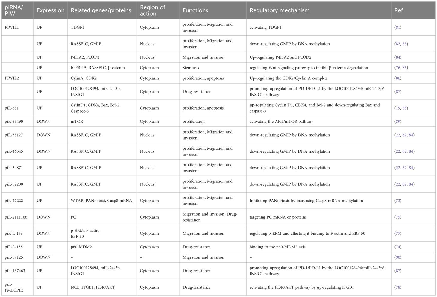 76. Zhou J, Xie H, Liu J, Huang R, Xiang Y, Tian D, et al. PIWI-interacting RNAs: Critical roles and therapeutic targets in cancer. Cancer Lett. (2023) 562:216189. doi: 10.1016/j.canlet.2023.216189