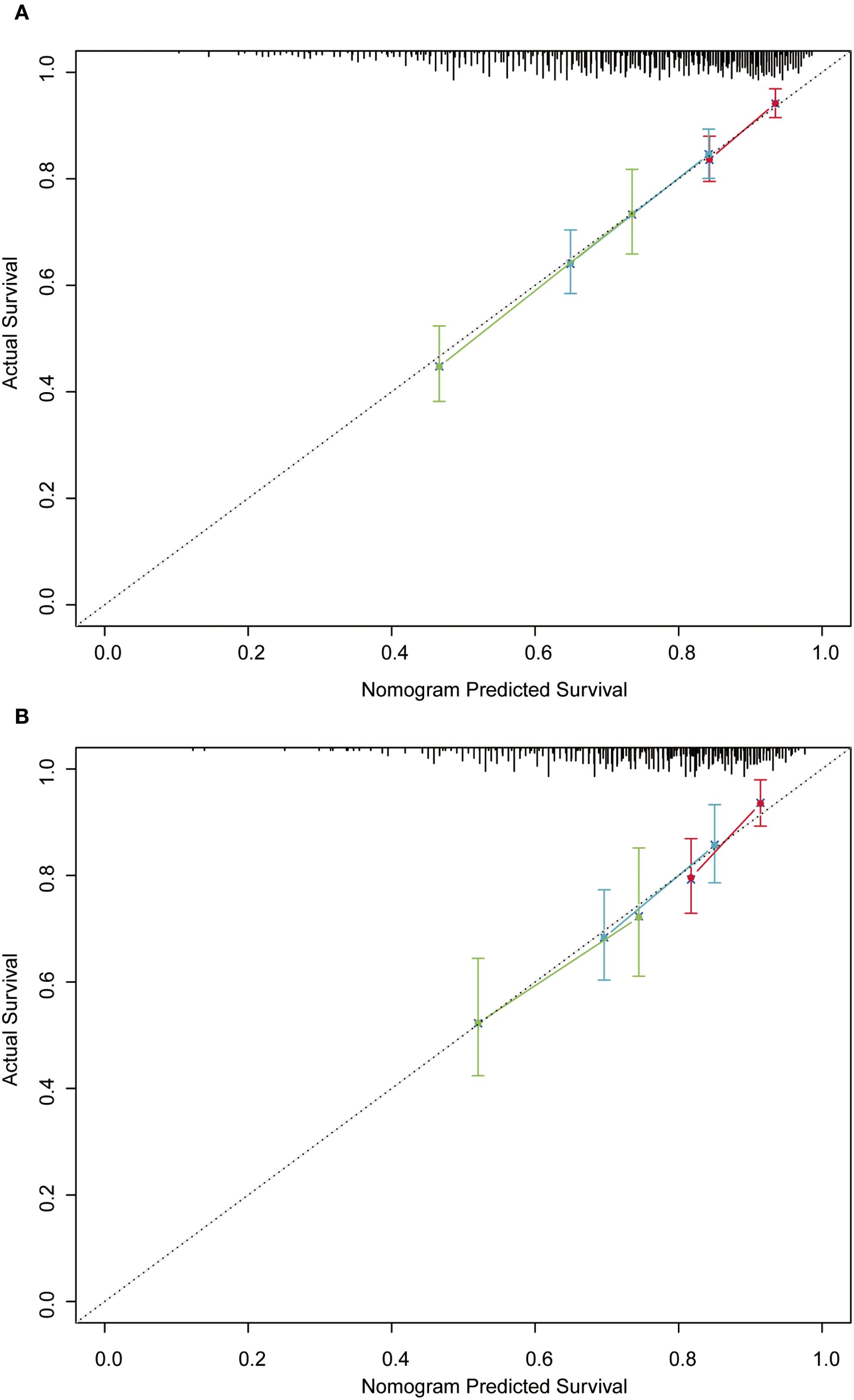 In order to further validate the reliability of this nomogram, we performed internal validation in our study. The C-index in the validation cohort was 0.655 (95% CI: 0.542-0.676) and the AUCs for 3-, 5-, and 8-year were 0.701, 0.663, and 0.633, which suggested the favorable diagnostic value (Figure 5B). The calibration curve exhibited a good match (Figure 6B), and the DCA curves also had good clinical practicability (Figures 7D–F). Patients in the validation cohort were then also classified into two groups in light of the nomogram: low-risk group (n=129) and high-risk group (n=130) (Figure 8B). The median OS were not reached in both of the low-risk group and the high-risk group. The cumulative OS rates for 3-, 5-, and 8-year were 79.8%, 68.6%, and 50.6% in the high-risk group, while 93.5%, 84.5%, and 74.7% in the low-risk group. In concordance with the training cohort, there was also a statistically significant discrepancy in OS among the two groups (P = 0.00058).