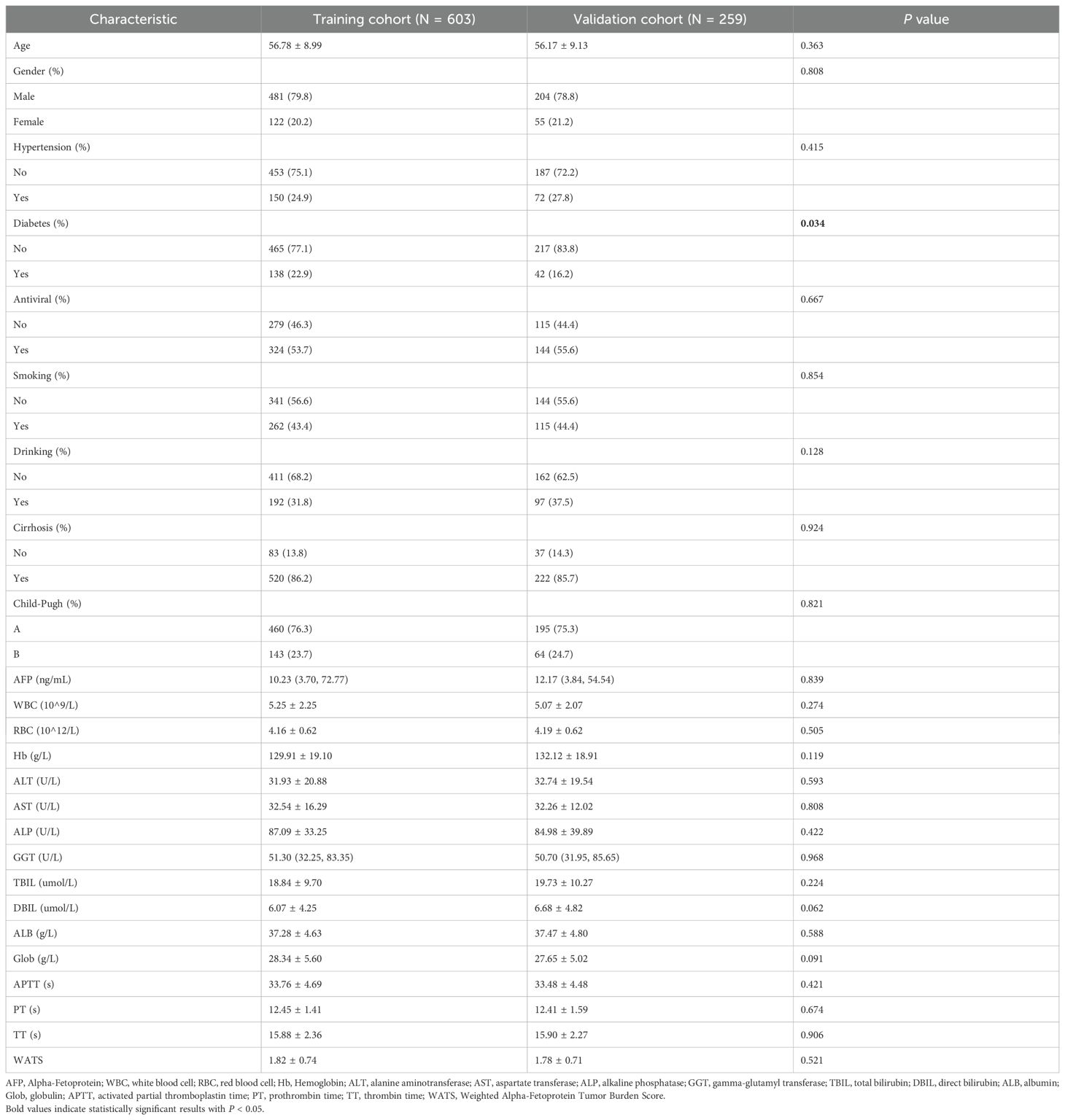 Among these patients, the average age was 56.60 years, with 685 (79.5%) males and 177 (20.5%) females. Notably, 377 (43.7%) patients had a history of smoking and 289 (33.5%) had a history of drinking. Furthermore, 222 (25.8%) individuals were diagnosed with hypertension and 180 (20.9%) with diabetes mellitus. The training and validation cohorts both had a majority of patients in Child-Pugh class A (76.3% and 75.3%, respectively).