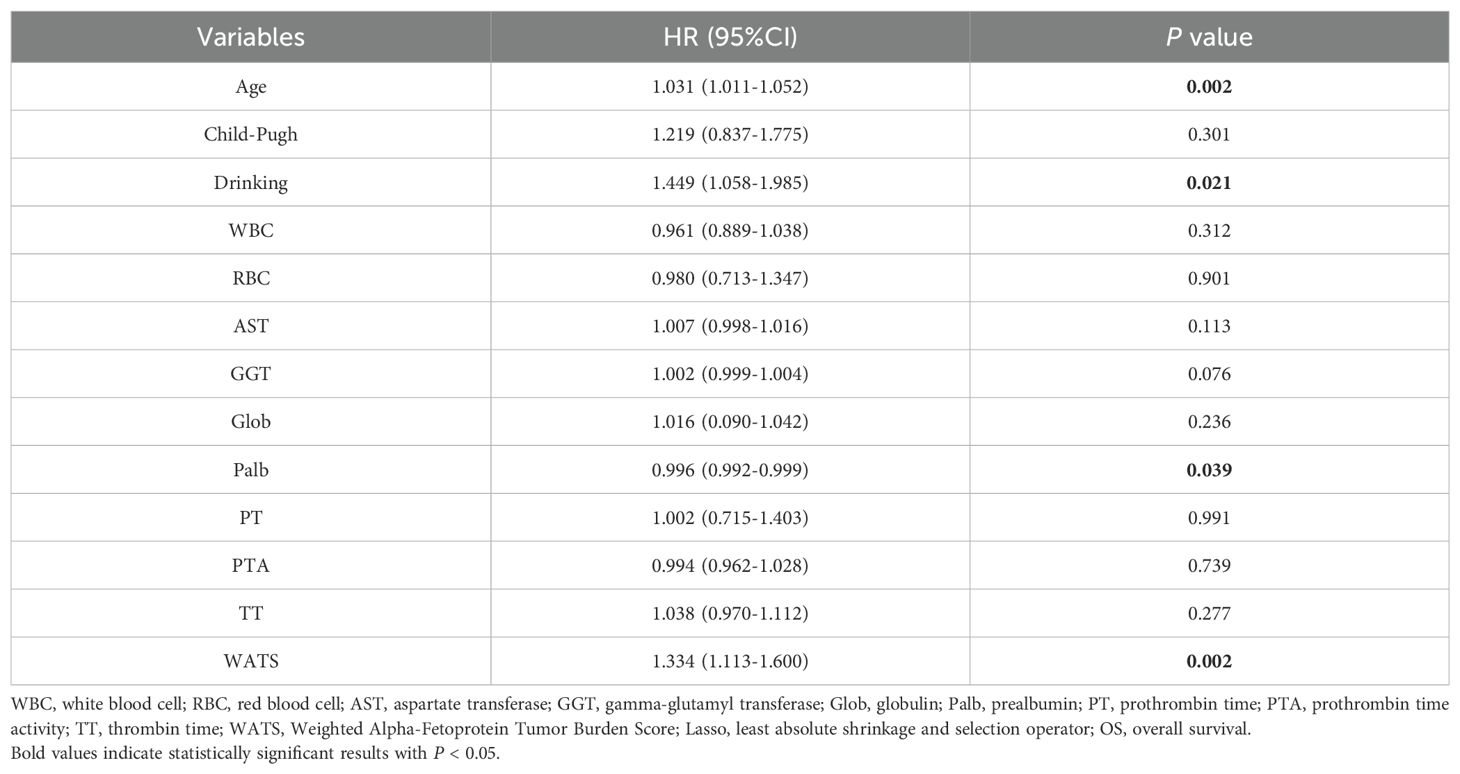 Lasso regression, utilizing a loss function with L1 regularization to penalize model coefficients while minimizing the objective function, was employed to screen risk factors associated with OS (Figure 2). The 10-fold cross-validation method was applied to select the optimal λ value, which was determined to be 0.0283 (Log λ = -1.548). Significant risk factors filtered by Lasso regression were age, history of drinking, Child-Pugh class, WBC, RBC, AST, Glob, GGT, Palb, PT, PTA, TT, and WATS. These variables were further incorporated into the multivariable Cox regression analysis, revealing that WATS (HR:1.334, 95% CI: 1.113-1.600), age (HR:1.031, 95% CI: 1.011-1.052), history of drinking (HR:1.449, 95% CI: 1.058-1.985) and Palb (HR:0.996, 95% CI: 0.992-0.999) as the independent prognostic factors for OS (Table 3).