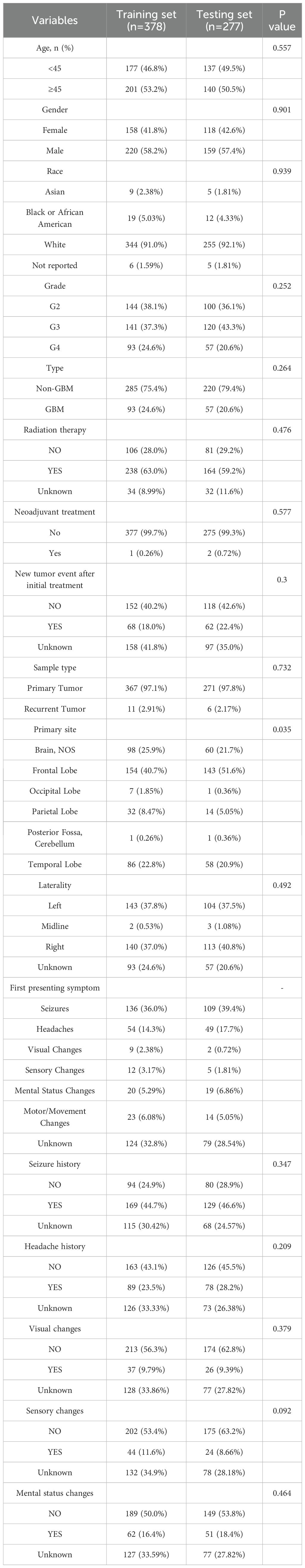 To construct and validate the prognostic model, a total of 655 glioma samples from TCGA were included. These samples were randomly divided into a training set (n = 378) and a testing set (n = 277) using a 3:2 ratio. Pathological classification was performed according to the 2021 WHO criteria, in which tumors diagnosed as grade IV gliomas were designated as GBM, while those with grade II–III were categorized as non-GBM gliomas.